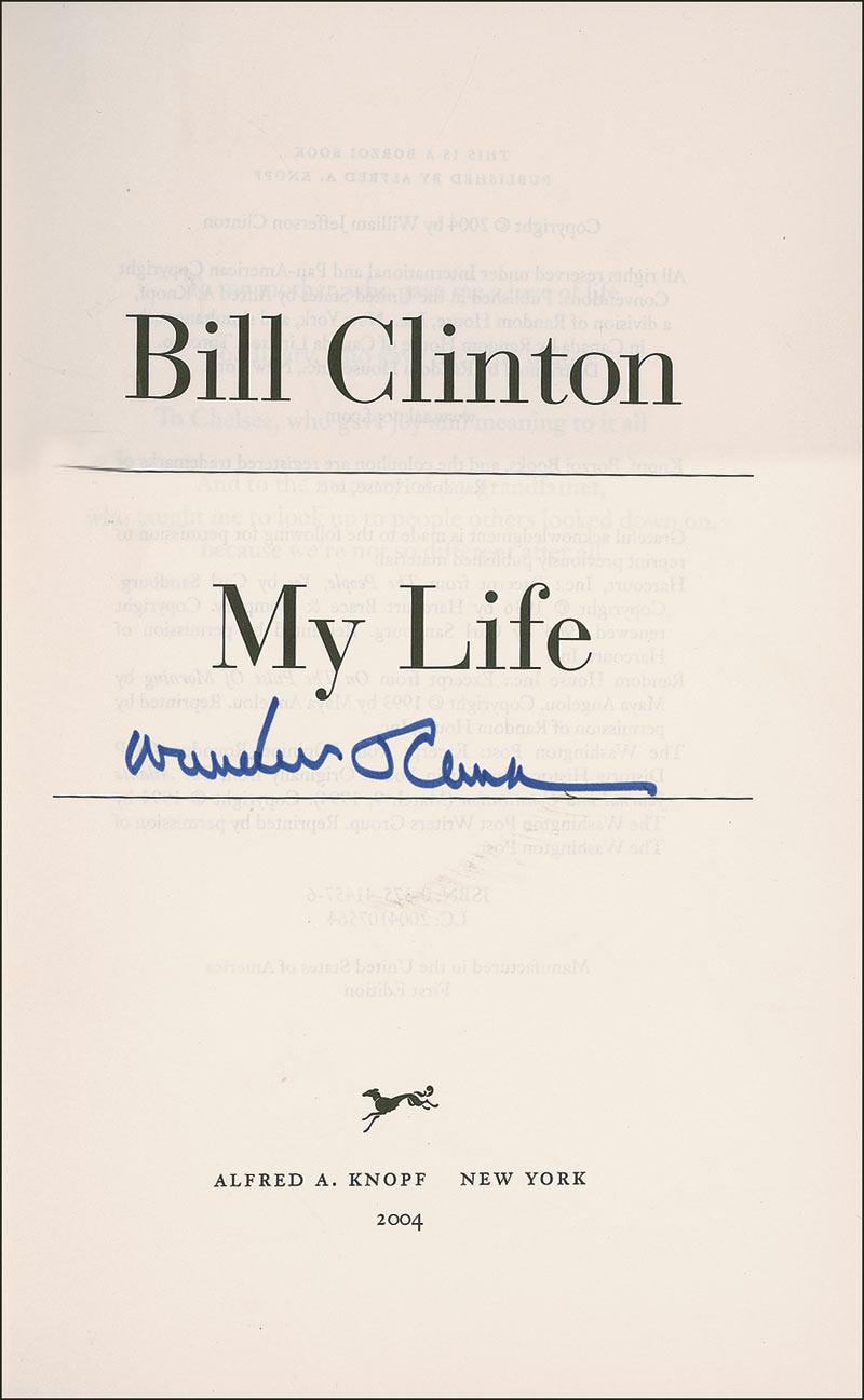 Signed book: My Life. First edition. NY: Knopf, 2004. Hardcover with dustjacket, 6.5 x 9.25, 957 pages. Signed in blue felt tip on the title page “William J. Clinton.” In fine condition. Pre-certified PSA/DNA and RRAuction COA.