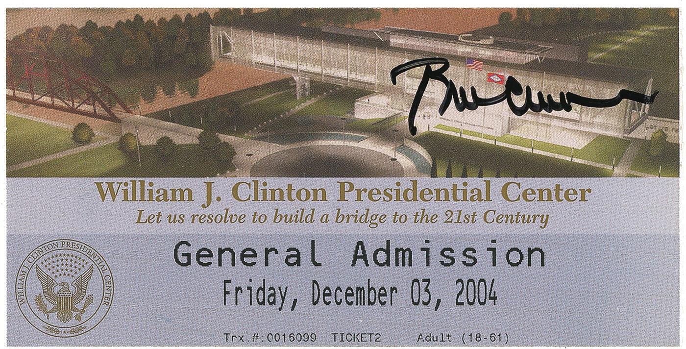 General admission ticket to the William J. Clinton Presidential Center, 6 x 3, signed on the front in black felt tip, “Bill Clinton.” In fine condition, with perforated left and right edges.
