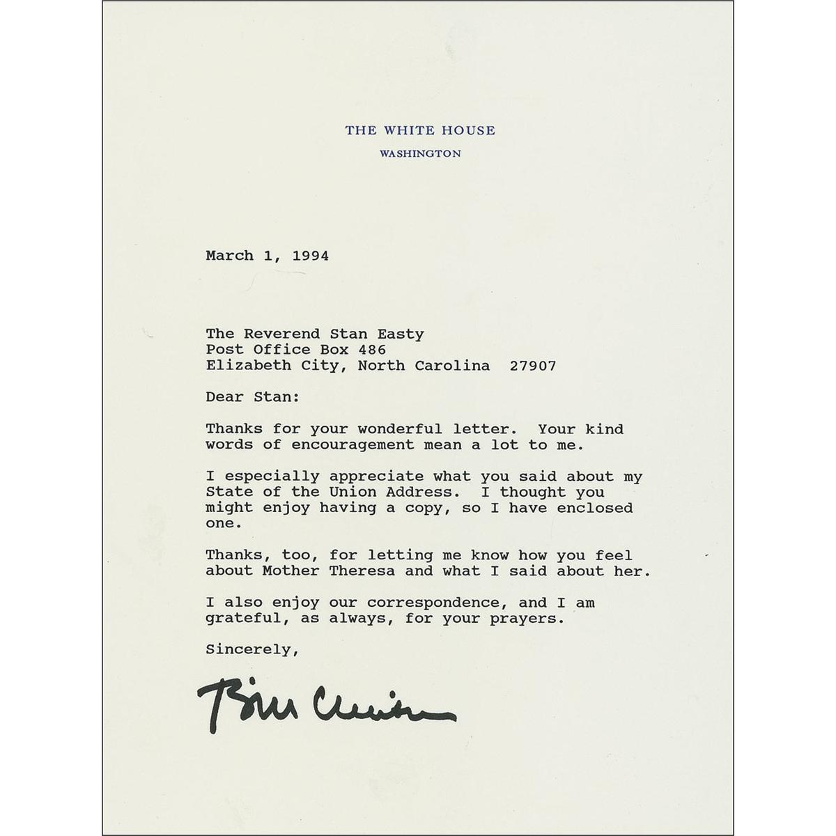 TLS as president, one page, 7 x 9, White House letterhead, March 1, 1994. Letter of thanks to Reverend Stan Easty, one of Clinton’s closest friends and spiritual advisors. In part, “Your kind words of encouragement mean a lot to me. I especially appreciate what you said about my State of the Union Address. I thought you might enjoy having a copy…Thanks, too, for letting me know how you feel about Mother Theresa and what I said about her…I am grateful, as always, for your prayers.” In fine condition.
