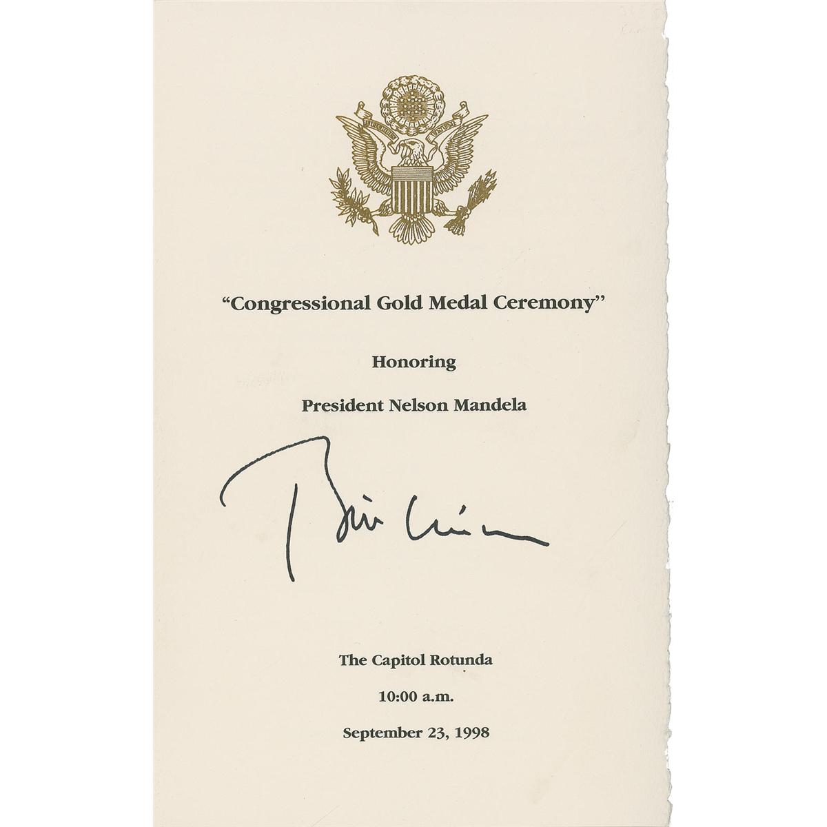 Program from the Congressional Gold Medal Ceremony honoring President Nelson Mandela, 6 x 9.5, two pages, held in the Capitol Rotunda on September 23, 1998, signed on the front cover in black felt tip. In very fine condition. A Congressional Gold Medal is an award bestowed by the United States Congress and is, along with the Presidential Medal of Freedom and the Presidential Citizens Meda,l the highest civilian award in the United States. The decoration is awarded to an individual who performs an outstanding deed or act of service to the security, prosperity, and national interest of the United States.