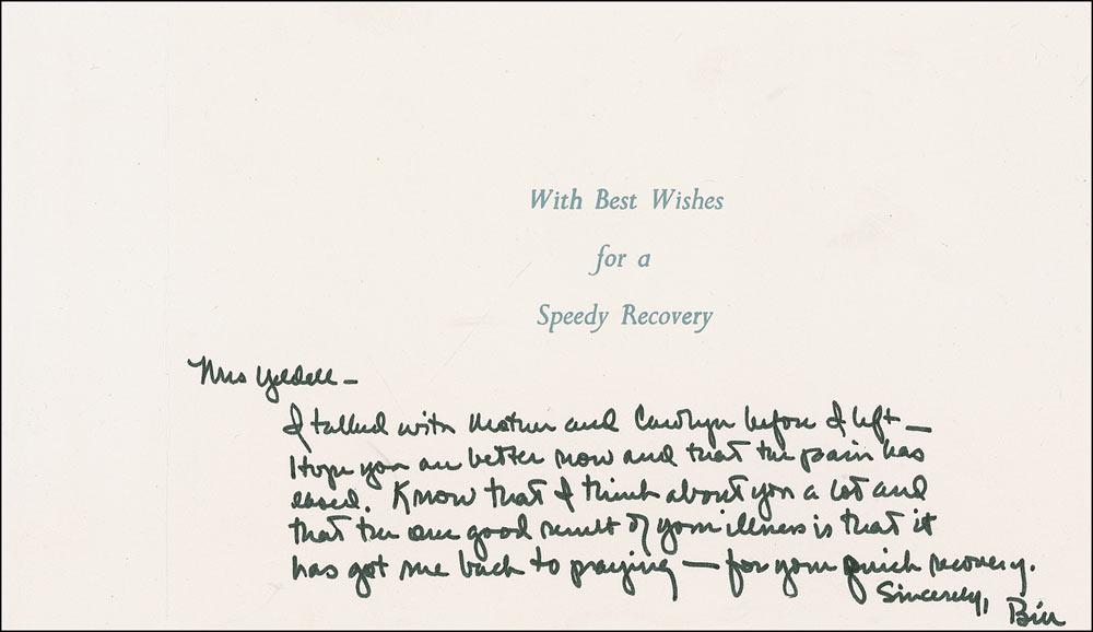 ALS signed “Bill,” written inside a 6.75 x 4.75 pre-printed get well card, no date. Get well card sent to Mrs. Yeldell. Clinton writes inside under the pre-printed sentiment, “I talked with Mother and Carolyn before I left-Hope you are better now and that the pain has eased. Know that I think about you a lot and that the one good result of your illness is that it got me back to praying-for your quick recover.” Research indicates Clinton was a school friend of a Carolyn Yeldell back in Arkansas. In very fine condition.