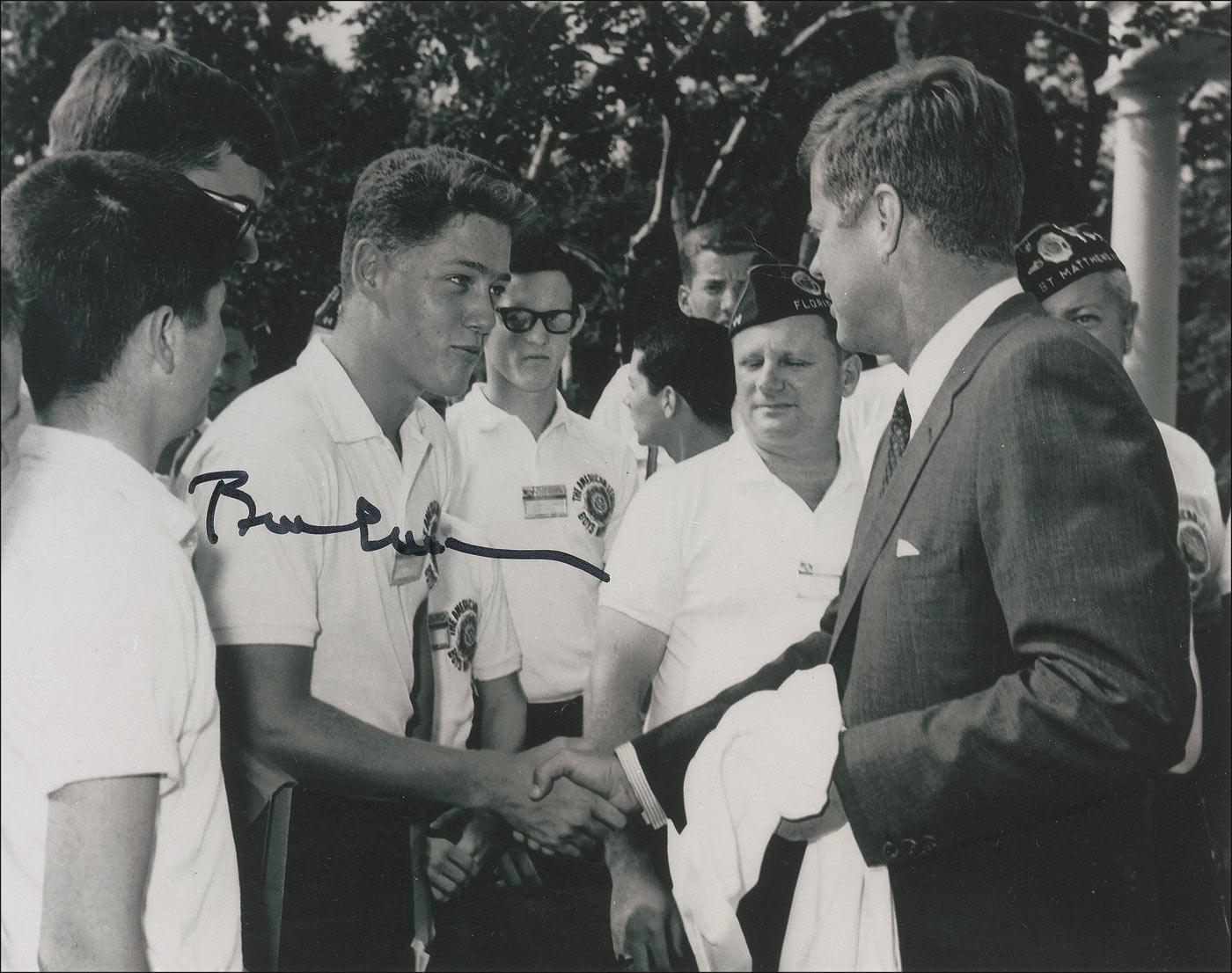 Famous satin-finish 10 x 8 photo of a youthful Bill Clinton shaking hands with John F. Kennedy, signed in black felt tip. In fine condition with a few small creases, one near JFK’s face. The future president met the president on July 24, 1963, in the Rose Garden when Clinton, a delegate from Arkansas to the Boys Nation Convention, visited the White House.