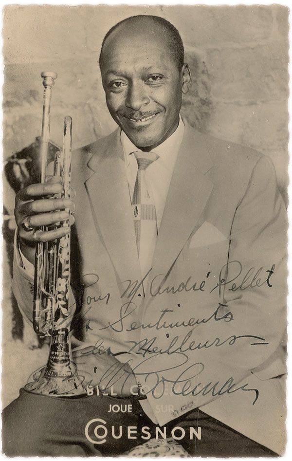 Jazz trumpeter (1904–1981) who worked with the likes of Fats Waller, Coleman Hawkins, and Django Reinhardt. Vintage 3.5 x 5.5 deckle-edge postcard photo of Coleman holding his trumpet, signed and inscribed in fountain pen in French. In fine condition, with scattered light wear and rubbing to finish and a bit of light contrast to beginning of signature.