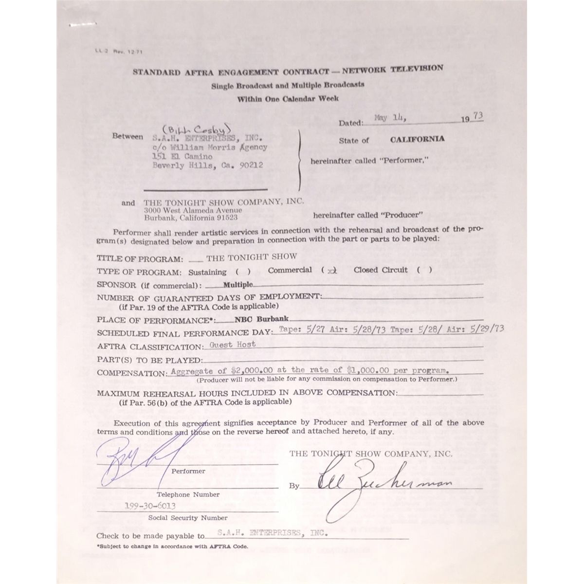 A rare historic multi page contract for Bill Cosby to host the Tonight Show in Johnnys absence in 1973 for several different nights signed and witnessed