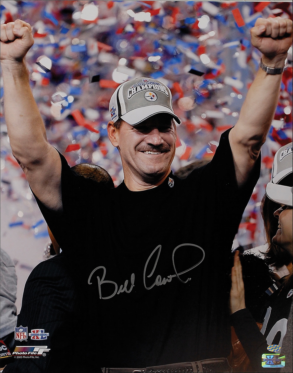 Color glossy 16 x 20 photo of Cowher celebrating the Steelers Super Bowl XL victory, signed in silver ink. In fine condition, with a holographic Super Bowl XL label and a smaller holographic label affixed to the lower right corner.