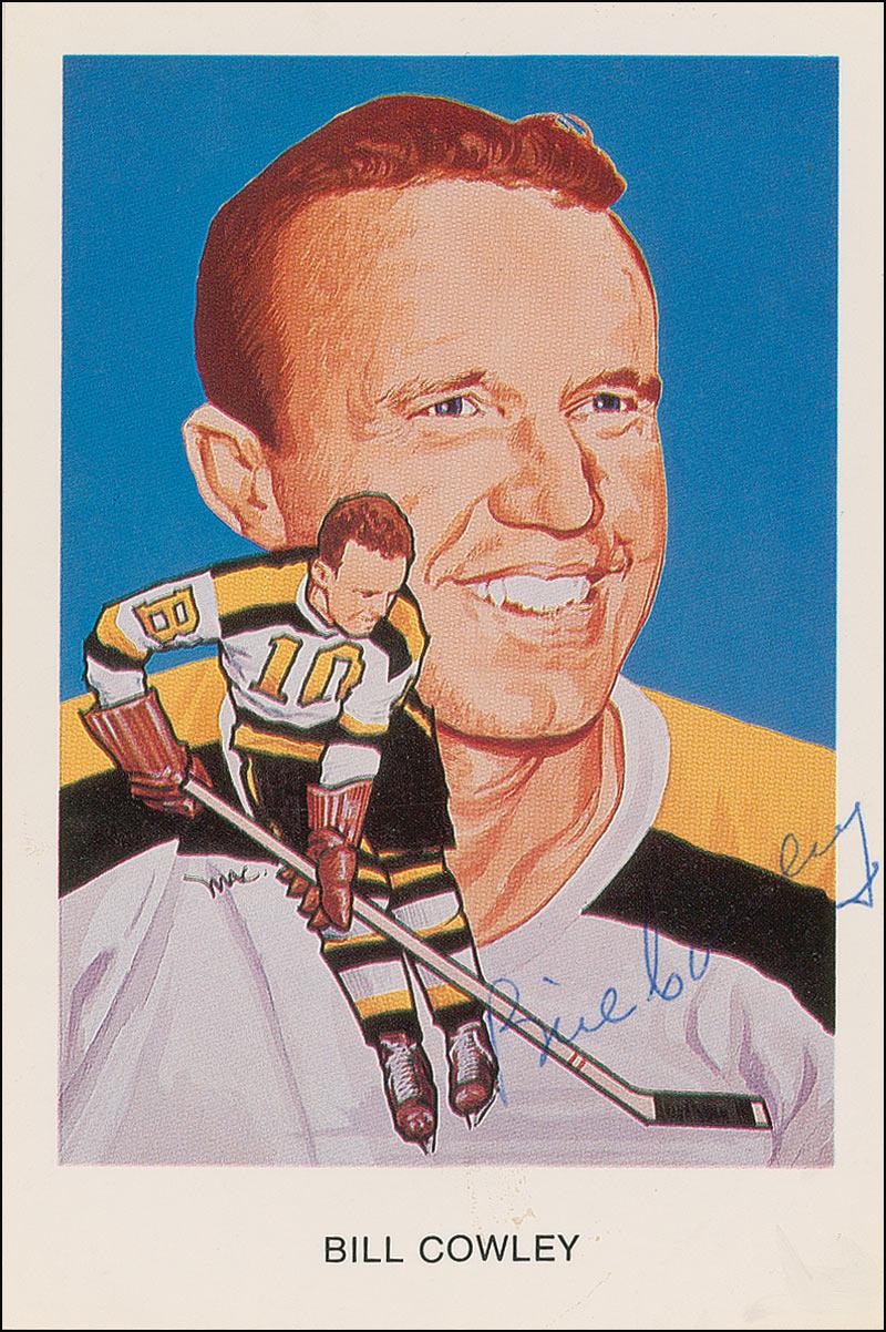 Hockey Hall of Famer (1912-1993). Color 4 x 6 Hockey Hall of Fame postcard photo of an artist’s rendition of Cowley in his Bruins jersey, signed in blue ballpoint. In fine condition.