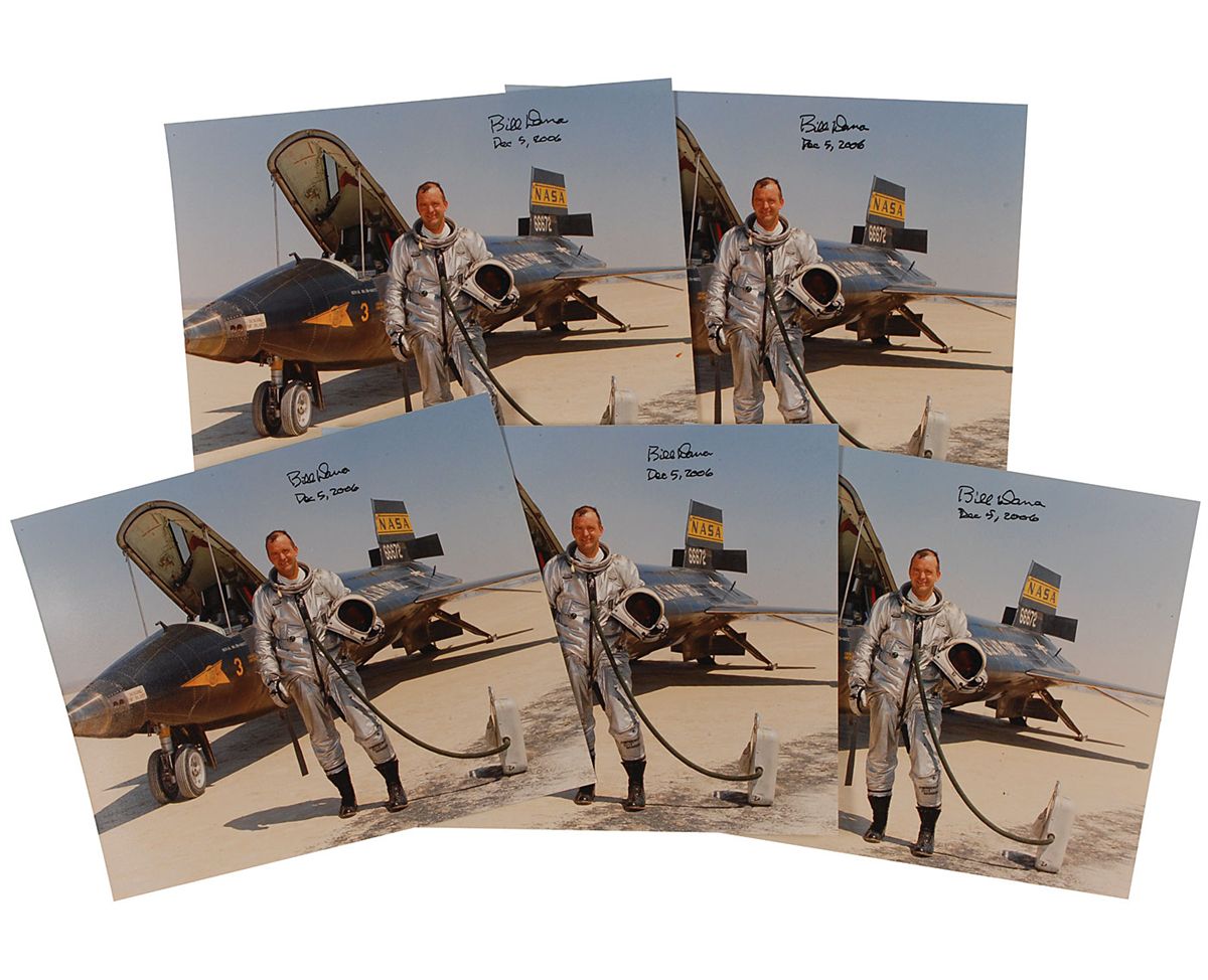 Collection of five identical 10 x 8 color satin-finish photos of Dana standing in front of his test plane, each signed in black felt tip by Dana, adding the date of signing to some of the photos. In fine condition.