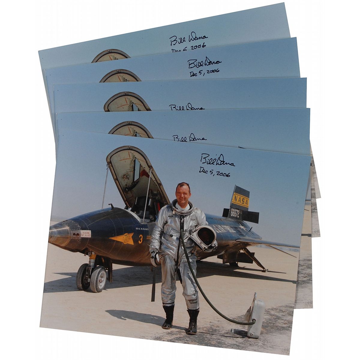 Collection of ten identical 10 x 8 color satin-finish photos of Dana standing in front of his test plane, each signed in black felt tip by Dana, adding the date of signing to four of the photos. In fine condition.