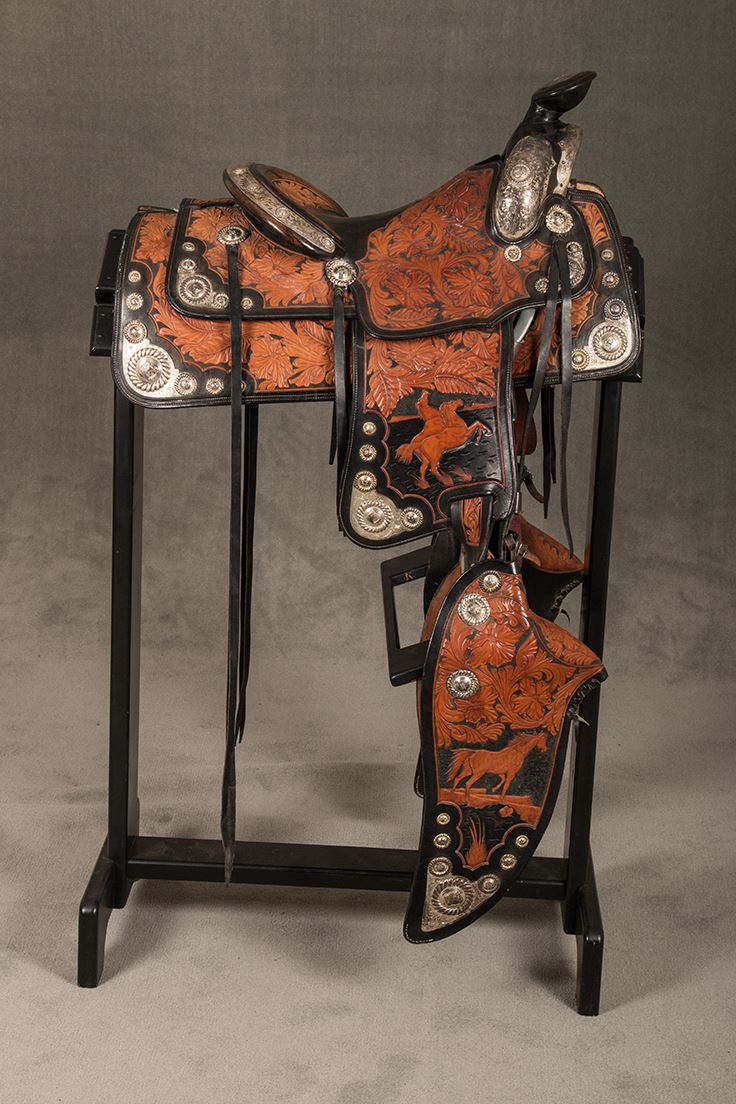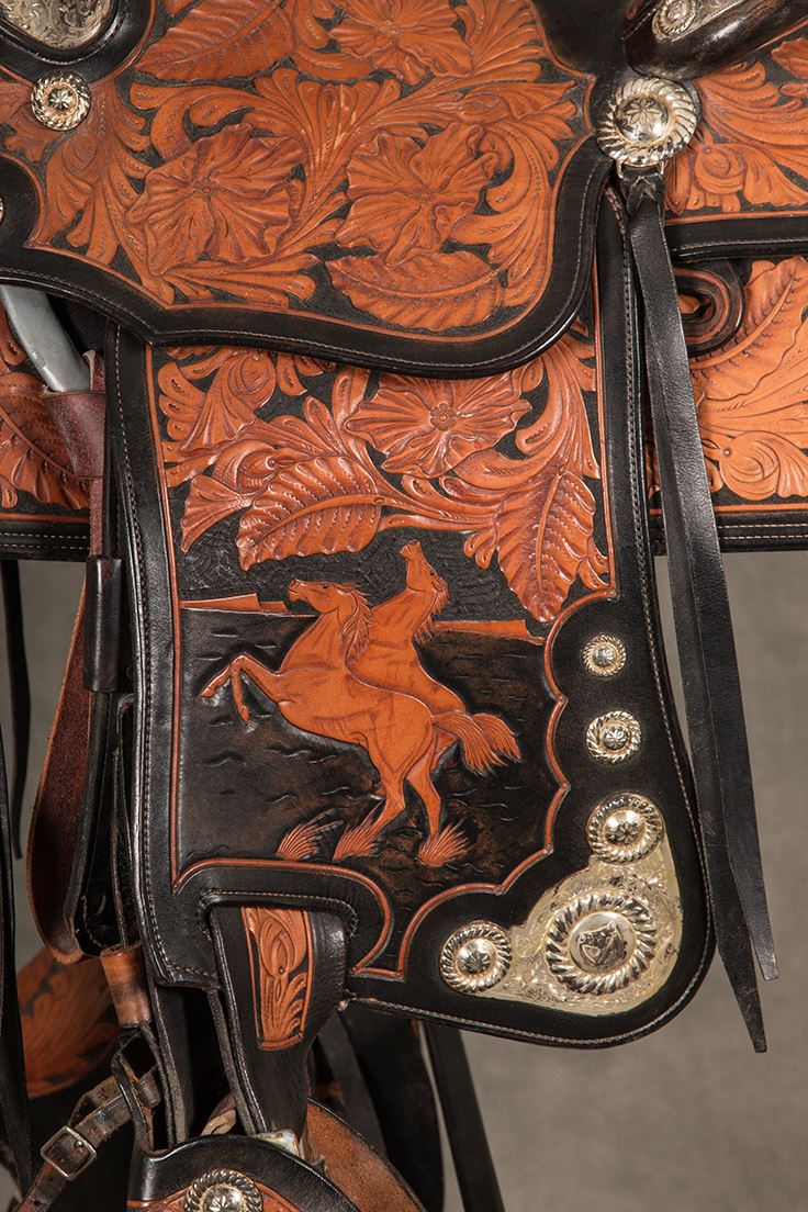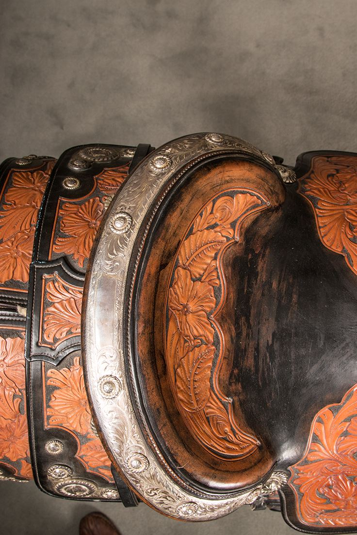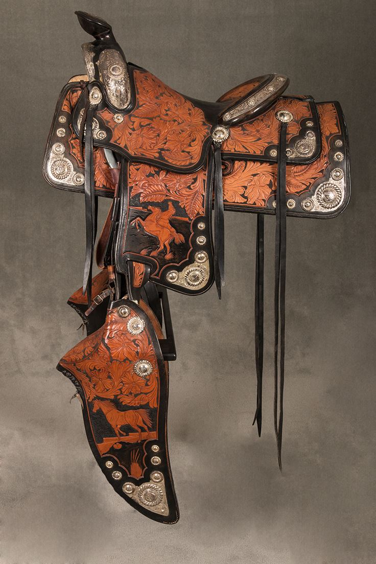 Bill Dean Saddlery (Burns, OR) Silver Mounted Saddle . Beautiful brown and black two-tone, deeply carved leather with dark borders. Fabulous craftsmanship in the form of floral designs and rearing horses on the fenders and a trotting horse on each full-sized tapadero. Loaded with sterling silver. Circa 1960's.