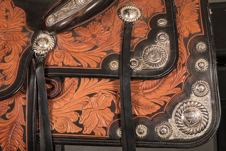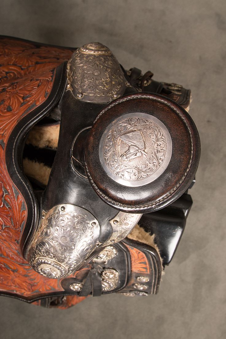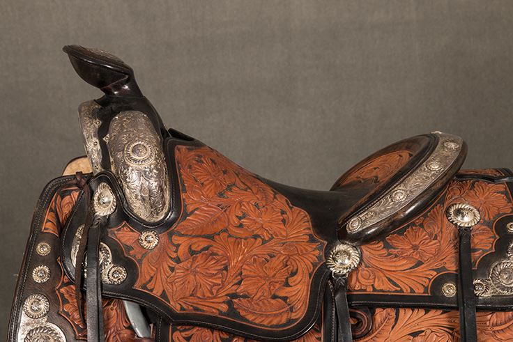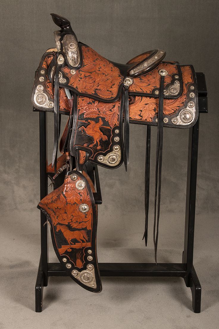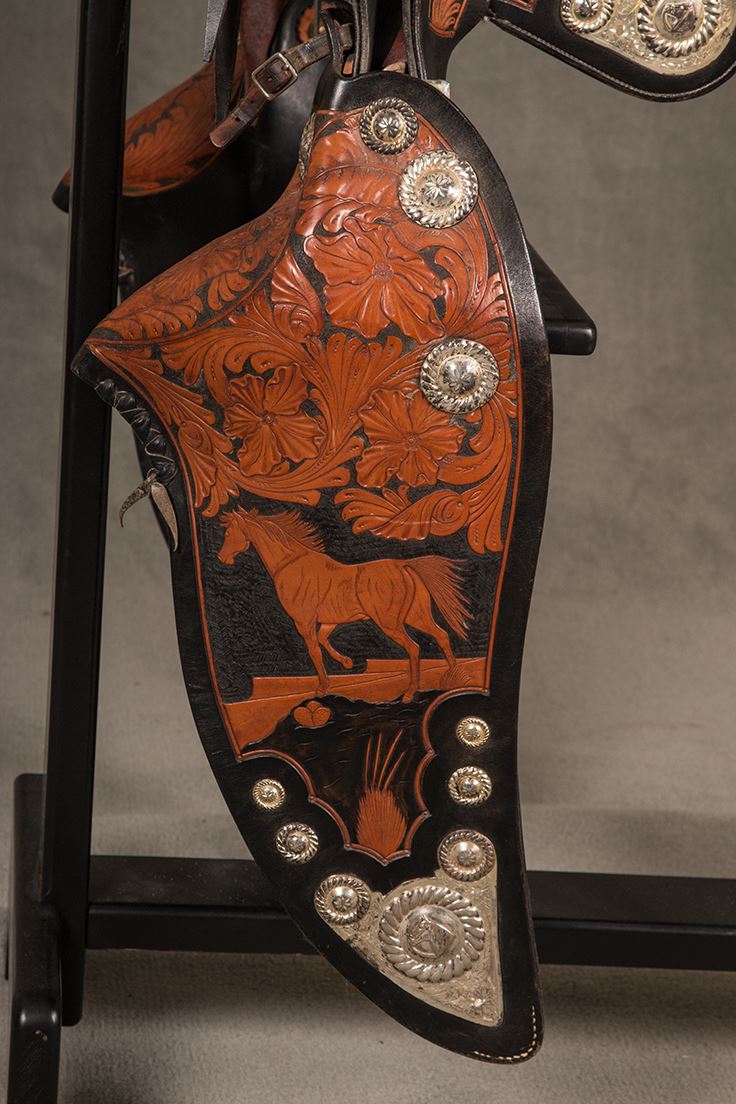Bill Dean Saddlery (Burns, OR) Silver Mounted Saddle . Beautiful brown and black two-tone, deeply carved leather with dark borders. Fabulous craftsmanship in the form of floral designs and rearing horses on the fenders and a trotting horse on each full-sized tapadero. Loaded with sterling silver. Circa 1960's.