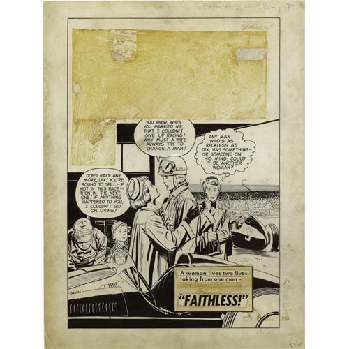 <B>Bill Draut and Marvin Stein (attributed) - Harvey Romance Cover Original Art (Harvey, circa 1950s)</B></I> Pity the worrying wife who marries a race car driver. Bill Draut captures all the melodrama of the moment with this tense scene. The image area of the cover measures 12" x 18". This cover hails from an unidentified Harvey romance title. Even the mother-in-law is involved! The cover is missing its title logo and a few pieces of type from the caption; otherwise, the art is in Good condition.