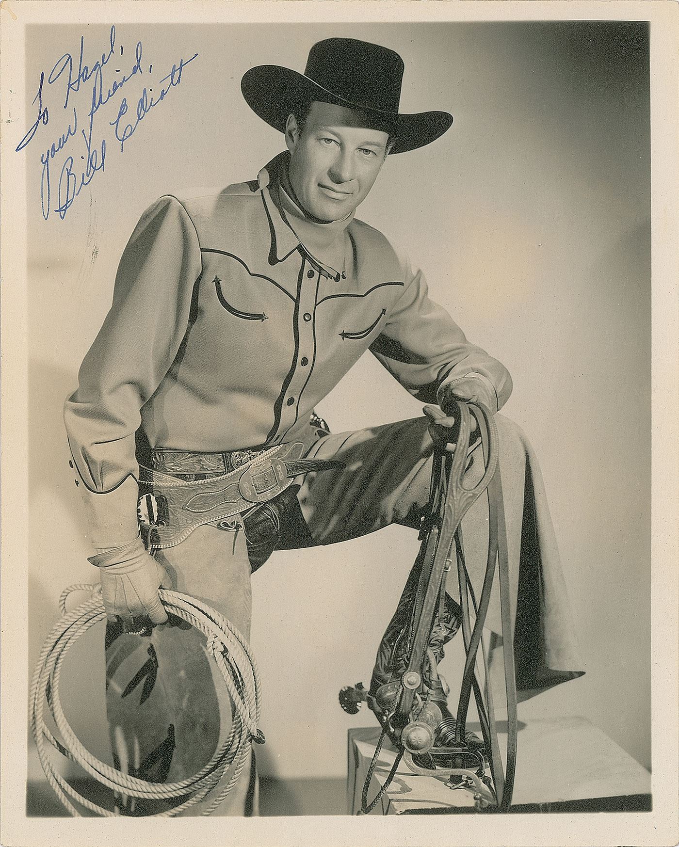Durable cowboy star (1904–1965) who, among other roles, played Red Ryder in the popular Republic film series. Vintage matte-finish 8 x 10 photo of 'Wild Bill' dressed up in Western garb, nicely signed and inscribed in fountain pen, "To Hazel, your friend, Bill Elliott.” In fine to very fine condition.