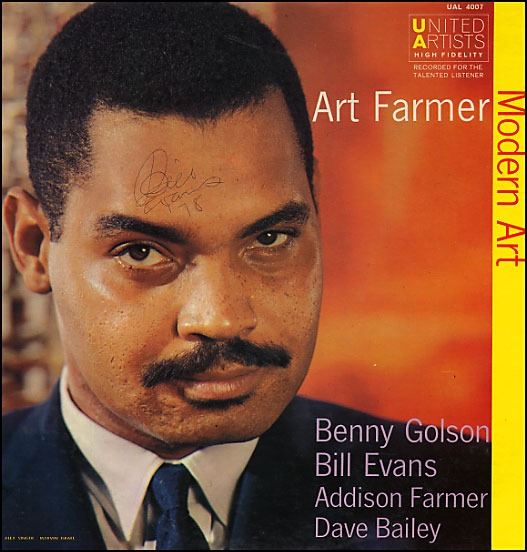 Innovative and highly regarded jazz pianist (1929–1980) who worked briefly with Miles Davis before forming his own trio in the late 1950s. Plagued by a decades-long struggle with hepatitis and drug addition, Evans died at the age of 51. Art Farmer's Modern Art album signed on the front cover in blue ballpoint, "Bill Evans '78." In fine condition, with some light cover wear. The record is included.