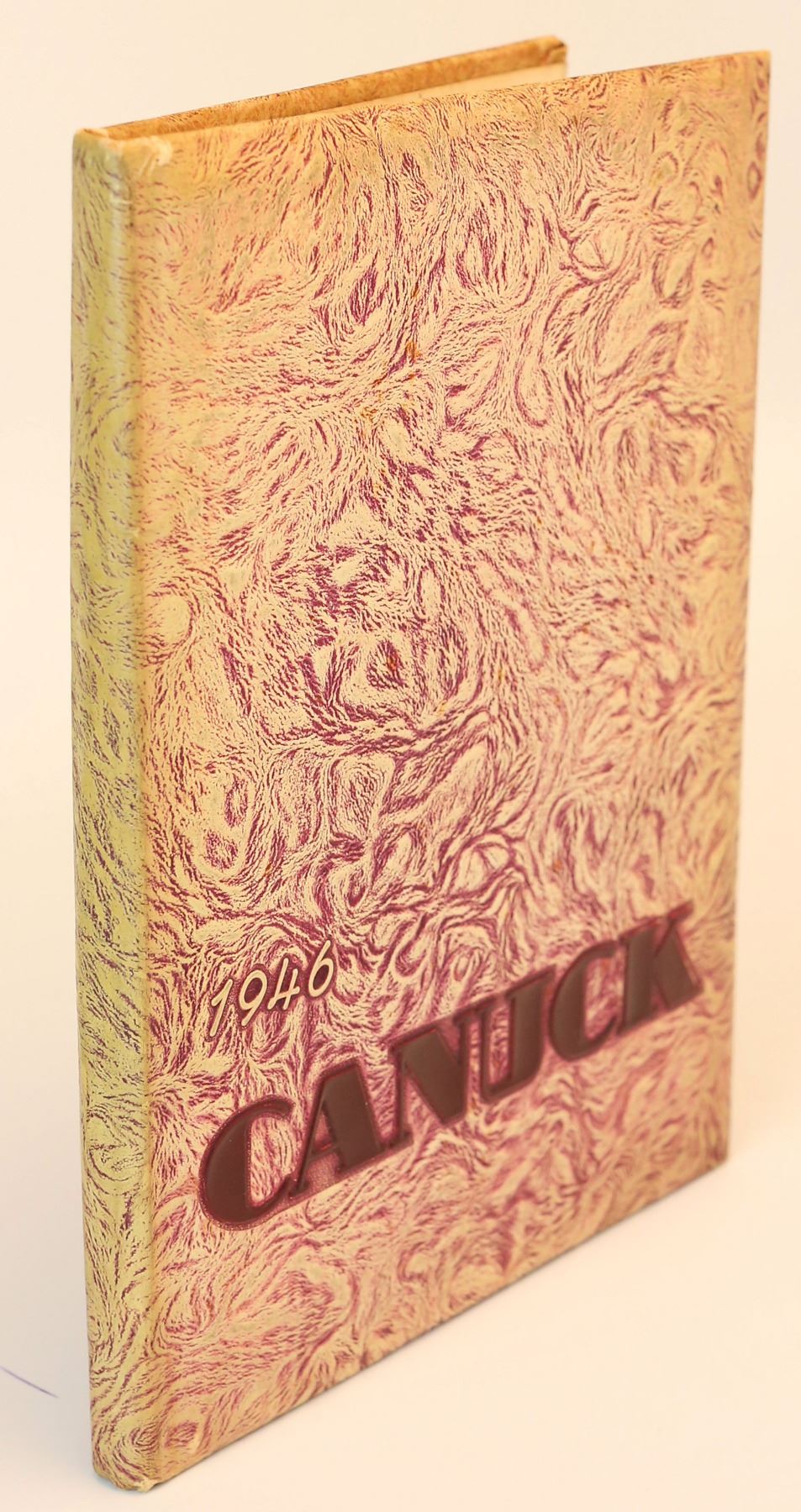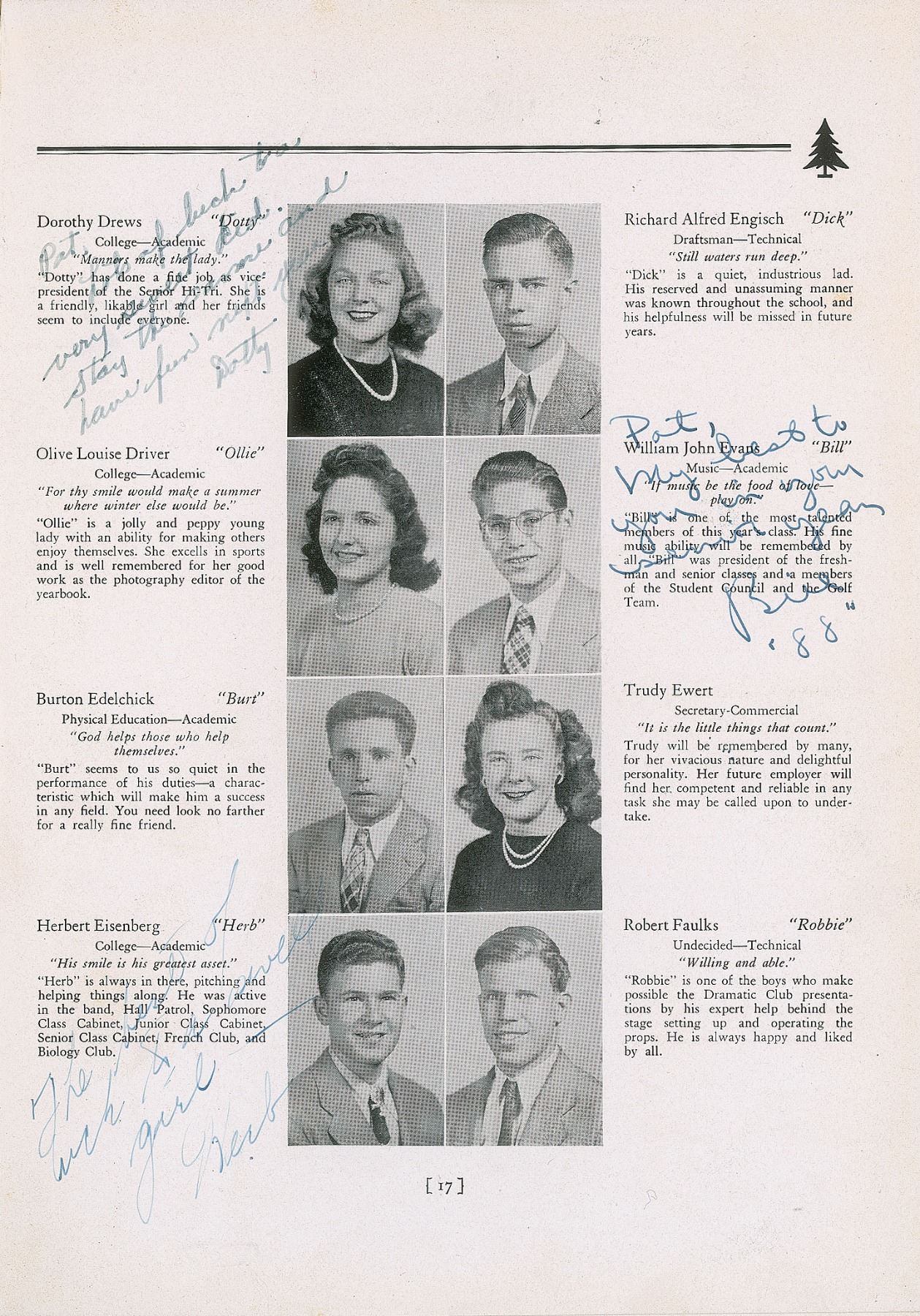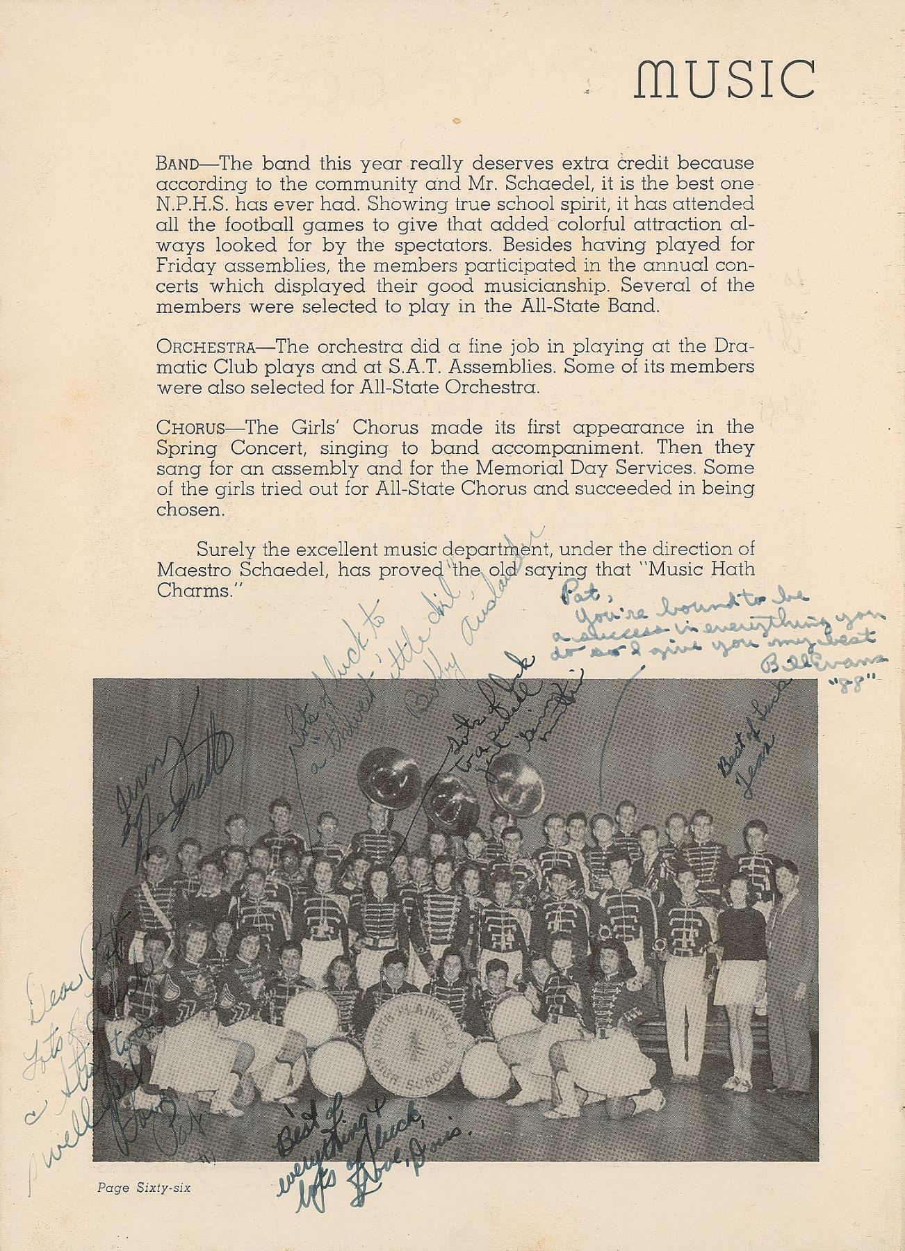 Innovative and highly regarded jazz pianist (1929-1980) who worked briefly with Miles Davis before forming his own trio in the late 1950s. Plagued by a decades-long struggle with hepatitis and drug addition, Evans died at the age of 51. Uncommon pairing of 1945 and 1946 Canuck yearbooks from Bill Evans’ junior and senior years at North Plainfield High School in North Plainfield, New Jersey, both 8 x 11. The 1945 yearbook is signed and inscribed on page 66 in black ink, “Pat, You’re bound to be a success in everything you do so I give you my best, Bill Evans ’88,’” with Evans pictured as a member of the band. The 1946 yearbook is signed and inscribed on page 17 in black ink, “Pat, My best to you in your senior year, Bill, ’88,’” with Evans signing next to his senior class portrait. In overall very good to fine condition, with expected wear and aging to the covers; interior pages are clean.