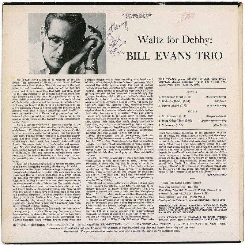 Innovative and highly regarded jazz pianist (1929–1980) who worked briefly with Miles Davis before forming his own trio in the late 1950s. Evans’s influence as a keyboard artist has been acknowledged by the likes of Herbie Hancock, Chick Corea, and Keith Jarrett. Plagued by a decades-long struggle with hepatitis and drug addition, Evans died at the age of 51. Waltz for Debby album signed on the back cover in black ink next to his image, “Best always, Bill Evans ‘79.” In fine condition, with a bit of scattered light cover wear, and some slight edge toning. The record is included. Scarce in any form. RRAuction COA.