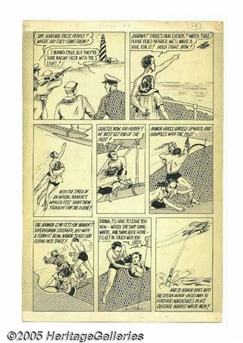 <B>Bill Everett - Marvel Comics #1 Sub-Mariner, page 12 Original Art (Timely, 1939).</B></I> A show-stopping masterwork from the dawn of the Golden Age, this page must rank as the most historically significant and treasured piece of original comic book art known to survive -- it's the final page of the Sub-Mariner's origin story from <B>Marvel Comics</B></I> #1! William Blake Everett (1917-1973), broke into comics in 1938, working for one of the first companies to print original stories for comic books, Centaur Publishing. In 1939, Bill Everett joined Lloyd Jacquet's Funnies Incorporated shop as the art director when former editor Jacquet and a few other talents broke away from Centaur. Everett created the Sub-Mariner as an eight-page feature originally printed in a giveaway comic book titled <B>Motion Picture Funnies Weekly</B></I> #1. <B>The Overstreet Price Guide</B></I> notes that this comic book was probably not distributed outside of advance copies, and estimates that only eight copies are known to exist. The Sub-Mariner character proved so marvelous that Jacquet repackaged Everett's origin story a few months later, with four additional pages added, for young pulp publisher Martin Goodman's title, <B>Marvel Comics</B></I> #1. So it was that Prince Namor became Marvel's first super-hero. This imaginative and beautifully rendered origin story is considered by Golden Age aficionados to be an unparalleled highlight of the early super-hero comics. The twelve-page thriller told the origin of the Sub-Mariner, "an ultra-man of the deep who lives on land and in the sea, flies in the air, has the strength of a thousand men, and is a youth of dynamic personality, with quick thought and fast action." In the slam-bang finale, the yarn ended with a splash, as the Sub-Mariner destroyed a lighthouse beacon light, flew aboard an enemy plane, disposed of the pilot with one terrific blow, and dove into the ocean with a solemn vow to continue his crusade against all surface men! Namor's cousin Dorma also starred. The image area of the page measures approximately 9" x 13.75" on 10" x 15" Craft-Tint duo-tone paper. The duo-tone shading remains vivid, and the art is in Excellent condition. Bill Everett signed the art in the lower right of panel seven. Everett took great pride in his work. He said, "I didn't want to swipe from anybody; it had to come from me. It was all Everett. Storytelling was my strong point." Everett remains one of the most talented and beloved comic book artists to ever work in the field. His original artwork is scarce and highly prized. This remarkable page is the earliest Bill Everett piece to ever come to light, and is the only complete page known to exist from a key Golden Age comic book. Don't miss your chance to own one of the oldest and most important pieces of art ever offered for sale -- Bill Everett's <I>Marvel</B></I>!