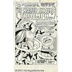 Bill Everett - Original Splash Page Art for Strange Tales #149, page 1 (Marvel, 1966). The Evil Kaluu, freed from five-hundred years of exile in the nameless dimension, has returned to exact vengeance upon his former companion, the wise, venerated Ancient One. This splash page, from the story, "If Kaluu Should Triumph...," written by Denny O'Neil, was penciled and inked by one of the Golden Age Masters of comics art, Bill Everett. Set against a paranormal panorama, the Ancient One and Dr. Strange are seized by unseen forces, all courtesy of one of the industry's legendary artists. The art measures approximately 13.5" x 21.5", with a 12.5" x 19" image area, and includes the original title type, and hand-drawn credit art. There is some slight aging apparent, a slight stain along the top edge, and some minimal white-out usage, but overall, this work is in excellent condition. Important notice: Heritage usually auctions material at the rate of 200-250 lots per hour. On some occasions eBay Live bid software or the Internet may not be able to keep up with the pace of the auction. We recommend placing a realistic absentee bid now as insurance to avoid disappointment. Occasionally the auctioneer may eliminate or reject an eBay Live bid, and the auctioneer may also reopen a lot after the close of the eBay live bidding (usually because we missed an audience bid), and may reject your bid even if it shows you as the winning bidder. By bidding via eBay Live, you agree that Heritage may award the lot to another bidder at its sole discretion under the circumstances described above or any other reasonable circumstances. Since eBay bids are not shown to us until we open the lot on the floor, we treat those bids just like floor bids. In most cases the floor responds before the eBay bid is presented to us, due to Internet lag time, so for consistency we have made it a policy that floor bids are always considered first over tie eBay live bids. Also please note that all Heritage lots purchased through eBay Live carry a 20% Buyer's Premium. Please make sure you read the Terms and Conditions before you bid.