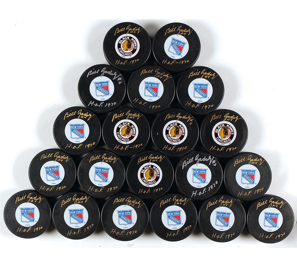 Twenty official NHL Ranger and Black Hawks hockey pucks, each signed on the logo side in gold ink, “Bill Gadsby #4, H.O.F. 1970.” In fine overall condition.