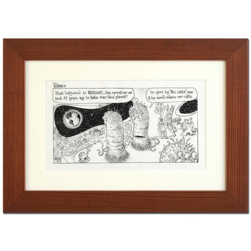 Enter a surreal and satirical world of twisted imagination and award winning creativity. "Bill Gates" is an original pen & ink drawing on paper by Dan Piraro, creator of the critically acclaimed and award winning comic strip, Bizarro! This piece is hand signed and comes framed. Includes Certificate of Authenticity! Measures approx. 21.5" x 15" (with frame), 13" x 7" (image).