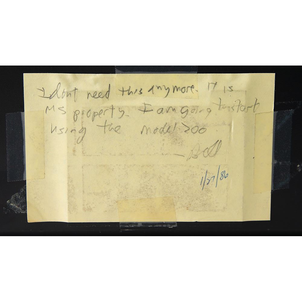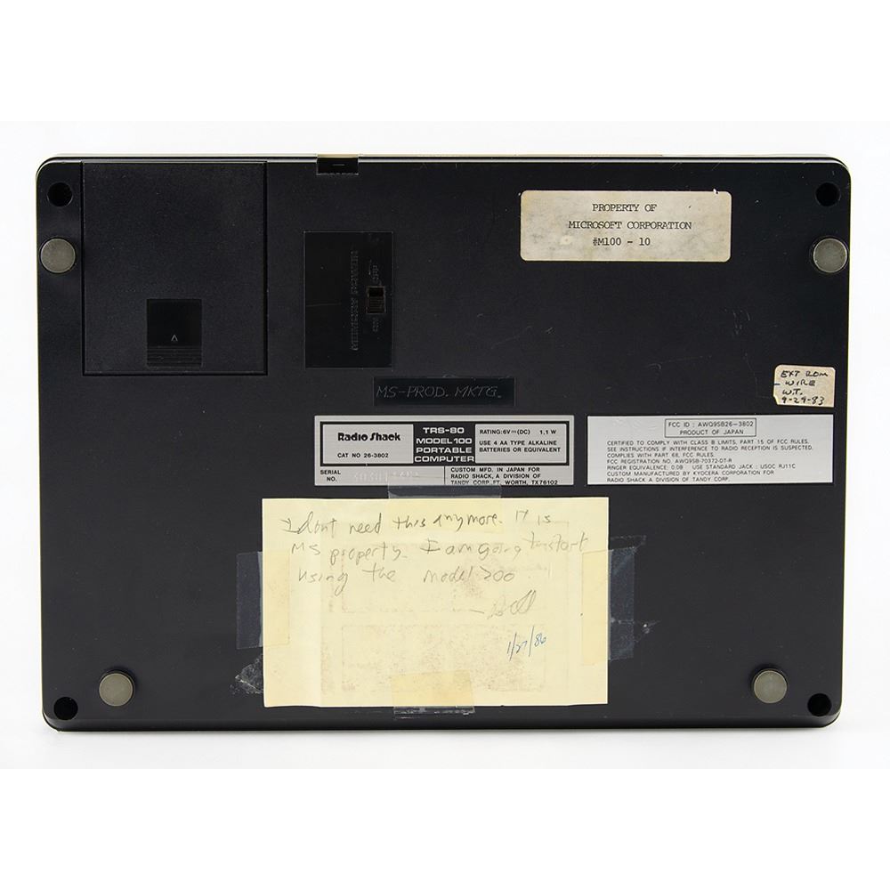 Incredible TRS-80 Model 100 portable computer that was personally used by Microsoft founder Bill Gates when he was an active software developer in the early-to-mid 1980s. Equipped with Microsoft’s N82 BASIC 80 programming software, the TRS-80 Model 100 was the last major coding project written by Gates as part of a Microsoft development team. The underside of the computer bears an affixed Post-It note with an ANS in pencil from Gates. The handwritten note, signed “Bill,†reads: “I don’t need this anymore. It is MS property. I am going to start using the model 200.†Another hand has dated the note to January 27, 1986. The underside of the computer is engraved “MS-PROD. MKTG,†and features two affixed labels, one typed “Property of Microsoft Corporation, #M100–10,†and the other annotated, “EXT ROM Wire, W.T. 9-29-83.†The Radio Shack parts label identifies the serial number as “303014451.†In fine, untested condition; the consignor affirms that the computer is fully functional.