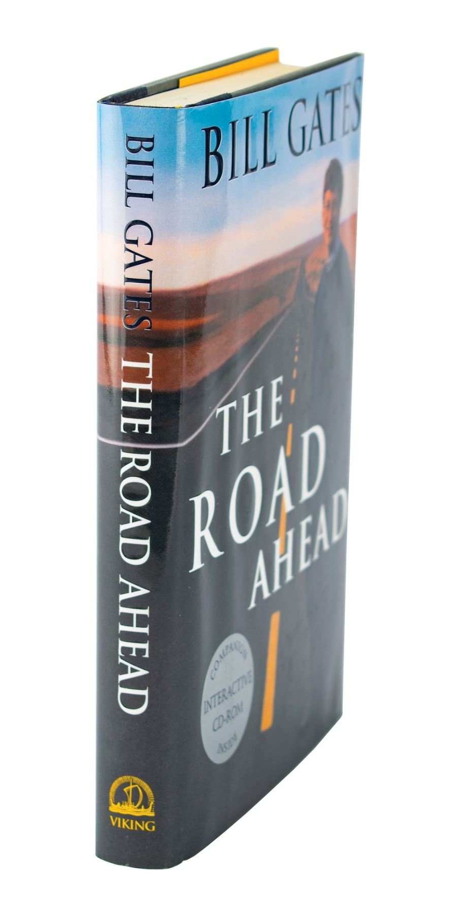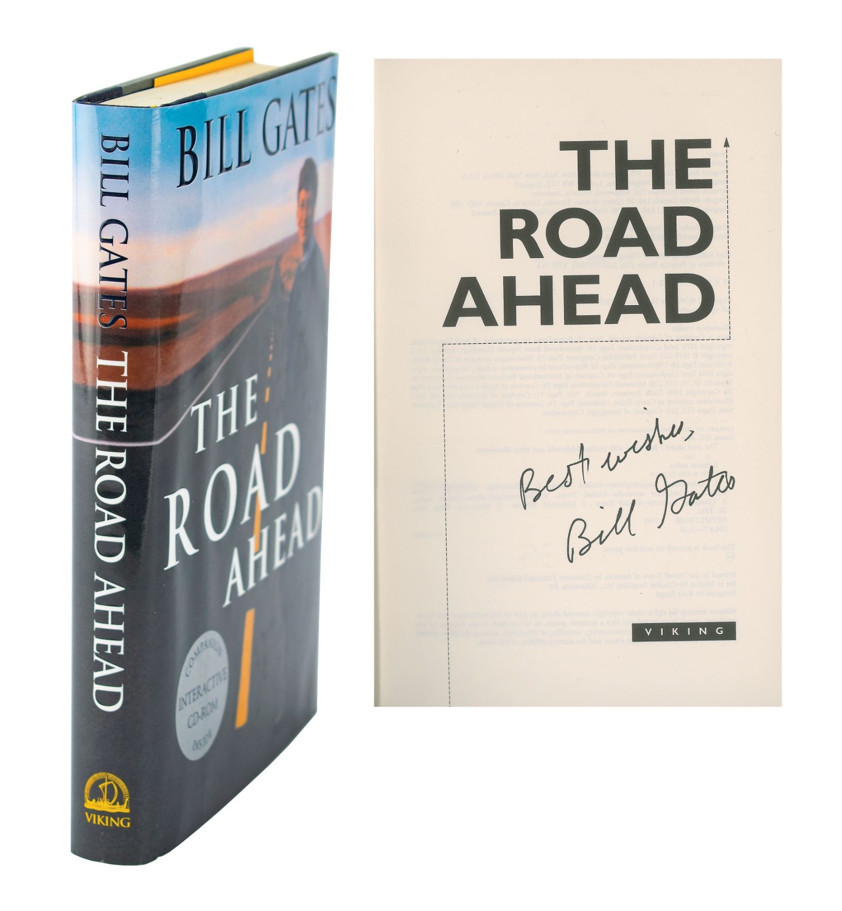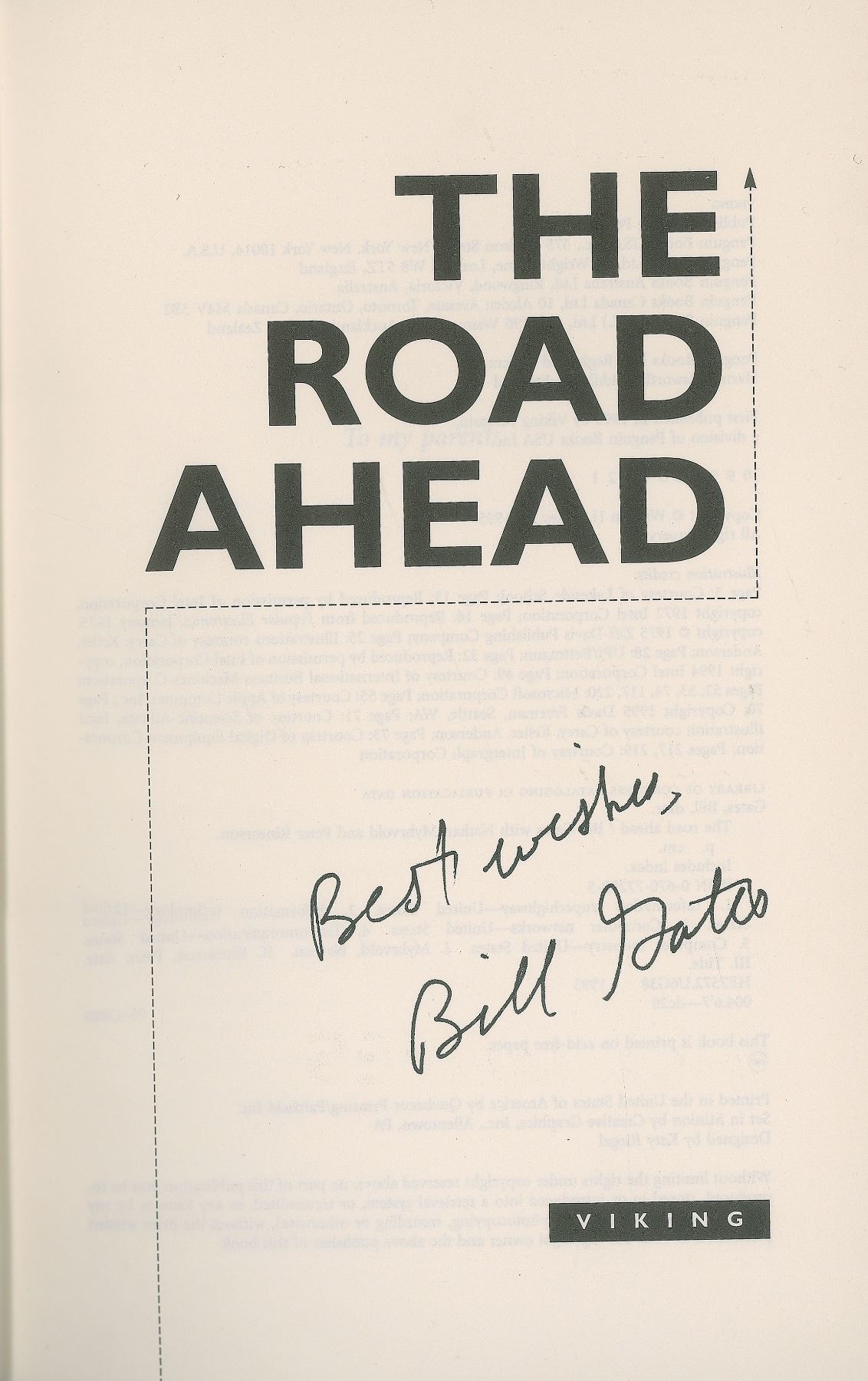 Signed book: The Road Ahead. First edition. NY: Viking Press, 1995. Hardcover with dust jacket, 6.5 x 9.5, 286 pages. Signed on the title page in black ink, "Best wishes, Bill Gates." In fine to very fine condition. Includes the companion CD-ROM.