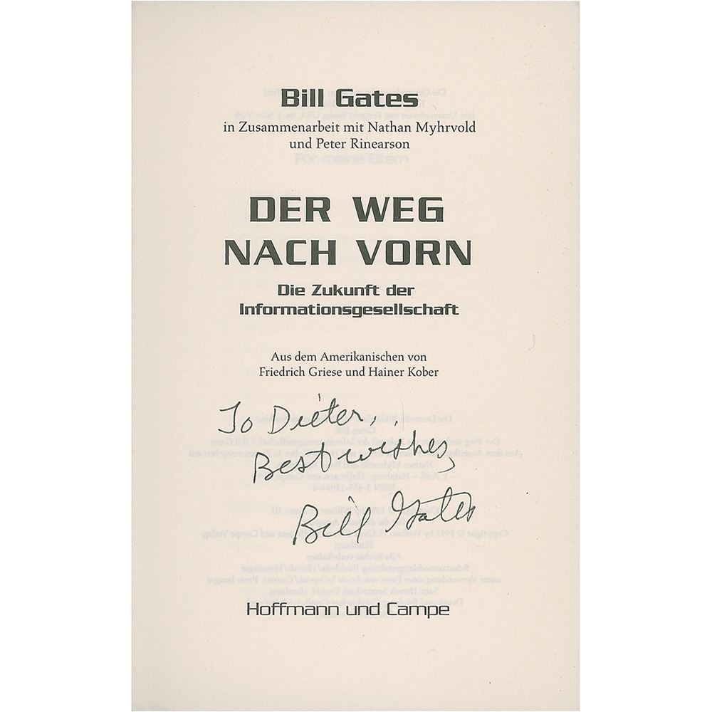 Signed book: Der Weg Nach Vorn [The Road Ahead]. Hamburg, Germany: Hoffmann und Campe, 1995. Hardcover with dust jacket, 5.75 x 8.5, 476 pages. Signed and inscribed on the title page in black felt tip, "To Dieter, Best wishes, Bill Gates." In fine condition.