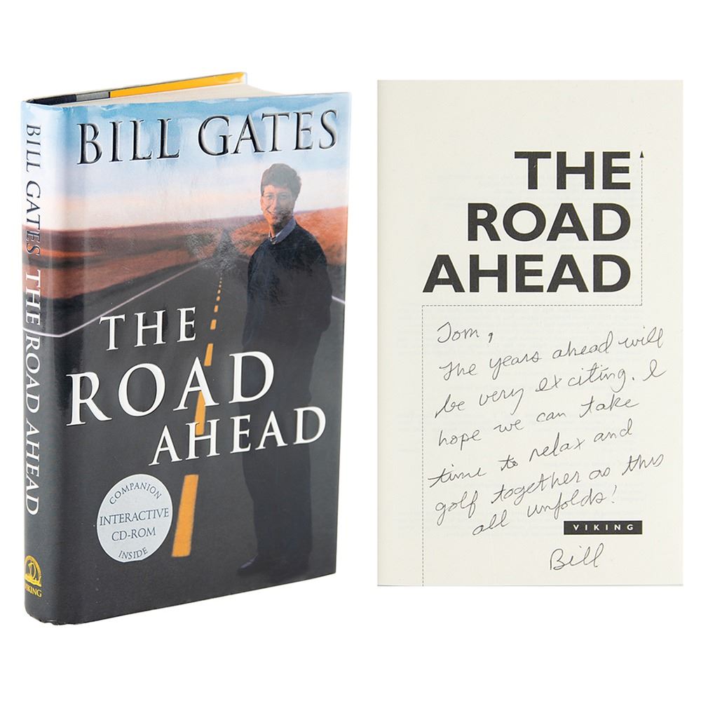 Signed book: The Road Ahead. First edition. NY: Viking Press, 1995. Hardcover with dust jacket, 6.5 x 9.5, 286 pages. Signed and inscribed on the title page in black ballpoint by Microsoft co-founder Bill Gates, "Tom, The years ahead will be very exciting. I hope we can take time to relax and golf together as this all unfolds! Bill." In fine condition. Includes the companion CD-ROM.