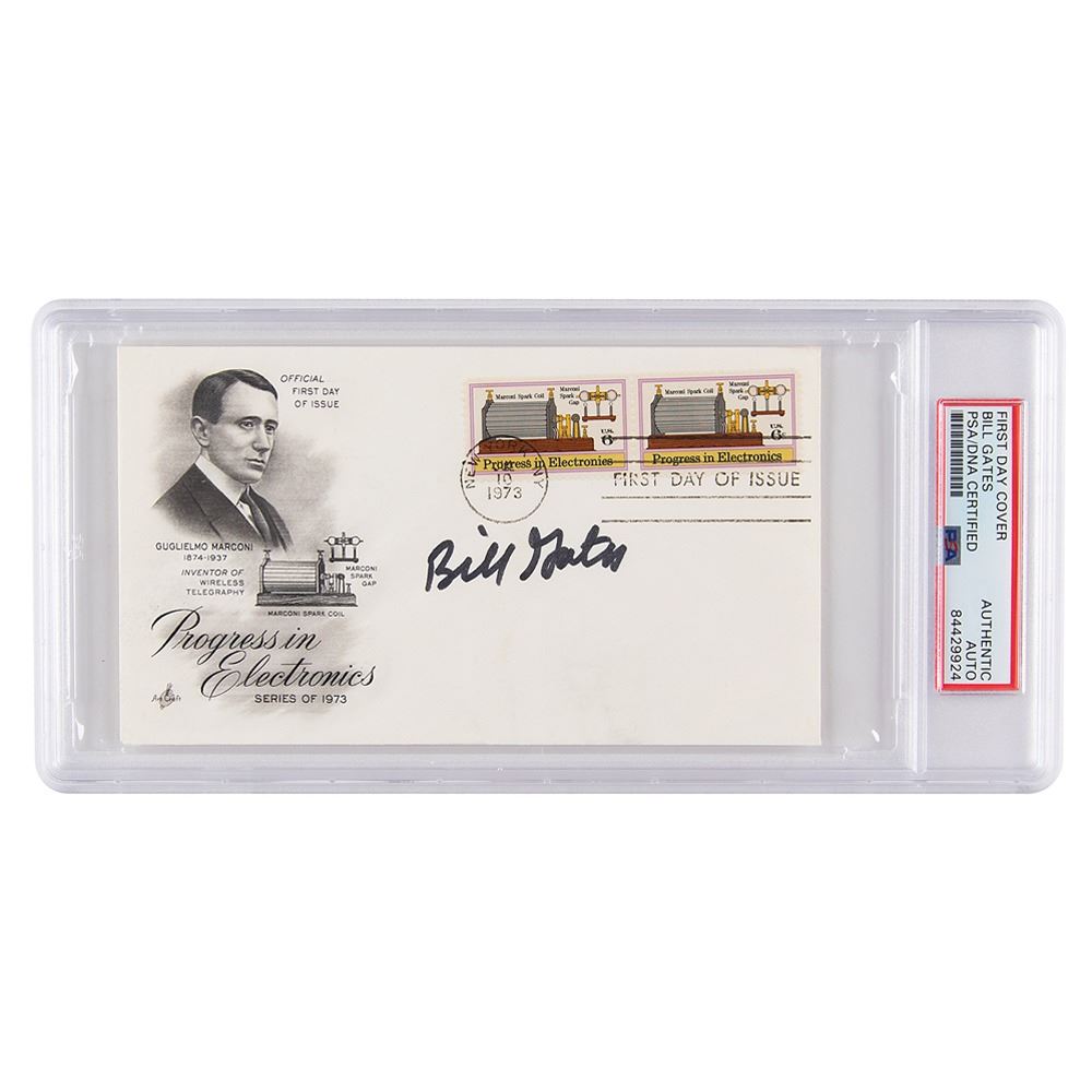 FDC with a cachet honoring Guglielmo Marconi and 'Progress in Electronics,' boldly signed in black felt tip, "Bill Gates." In very fine condition. Encapsulated in a PSA/DNA authentication holder.