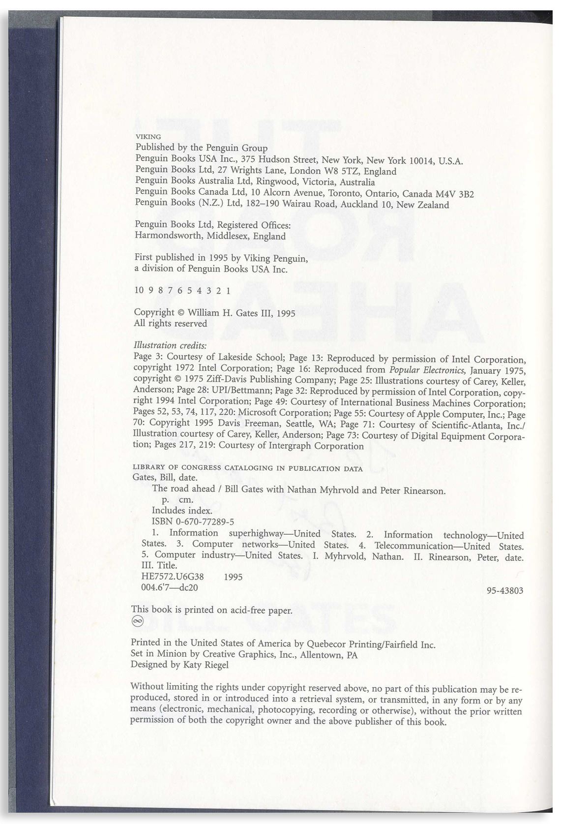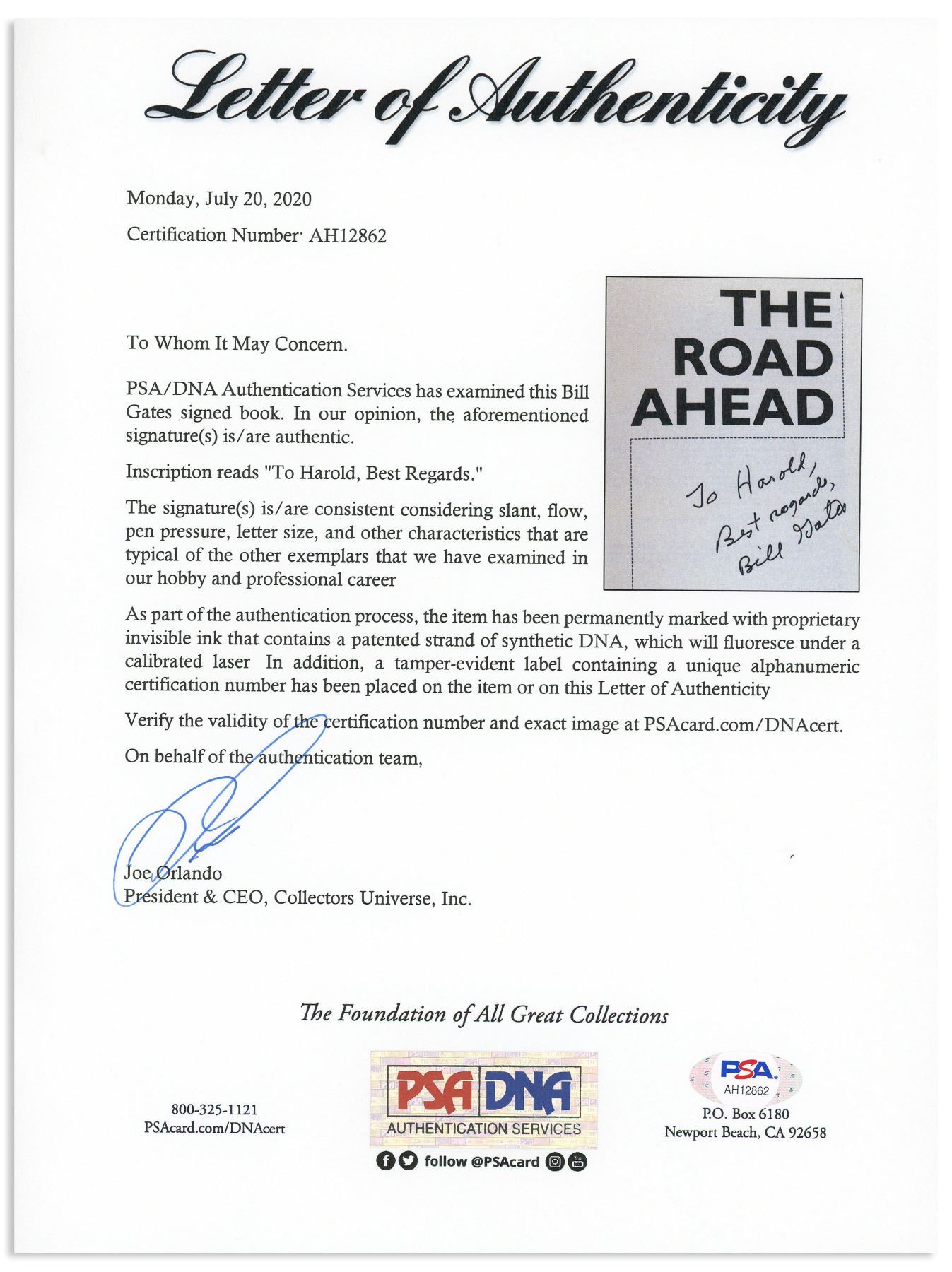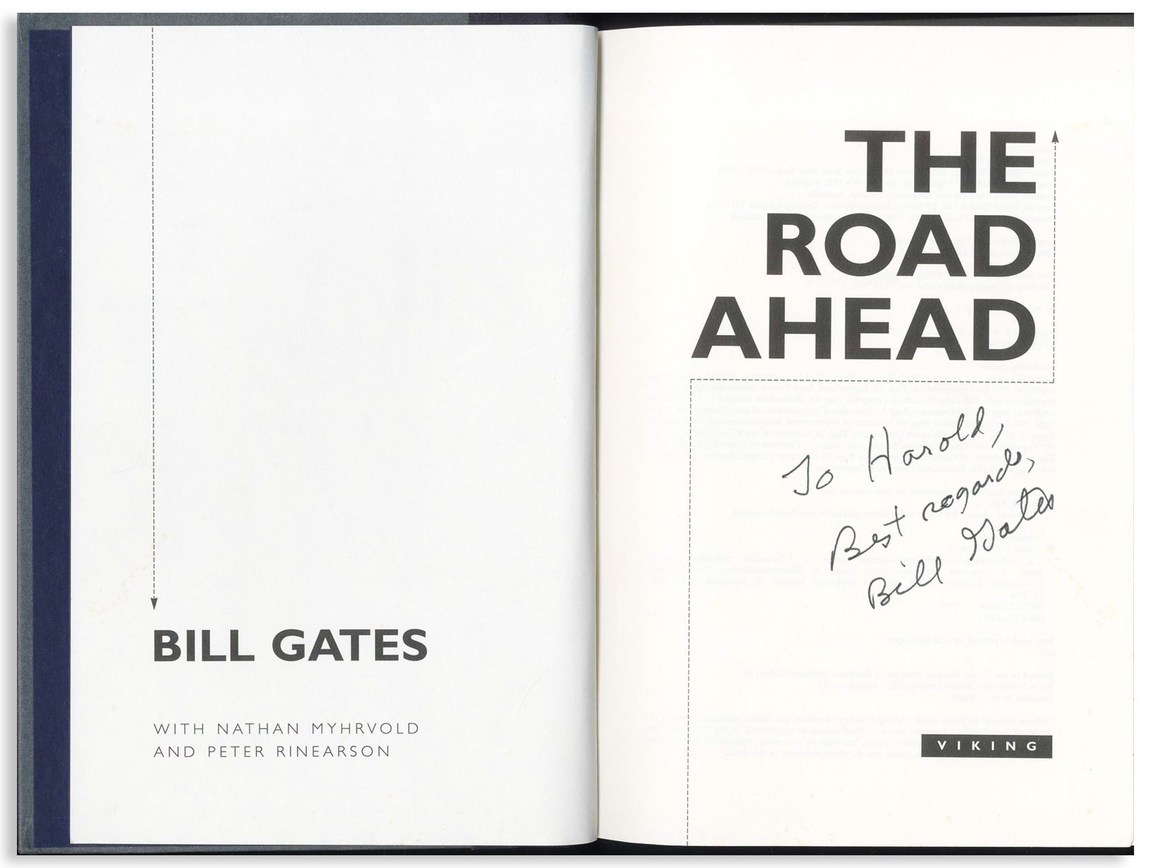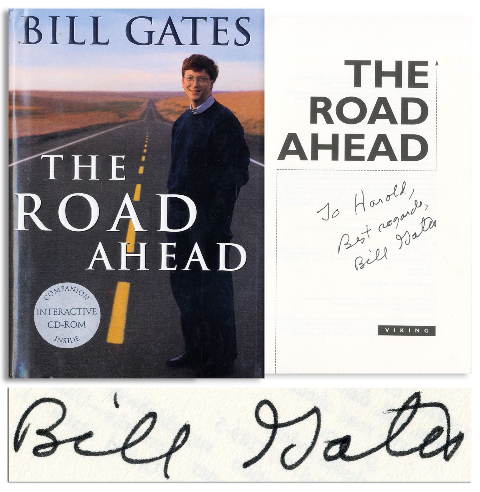 Bill Gates signed first edition of ''The Road Ahead'', a prescient book published in 1995 about the revolution of personal computing and the ''information superhighway'' that would become the Internet. New York: Viking Press, 1995. Rarely found signed, Gates pens the title page, ''To Harold, Best regards, Bill Gates'' in black felt-tip. Book measures 6.75'' x 9.25'' and runs 286pp. Complete in dust jacket showing $29.95 price and CD-ROM that accompanied the first edition. Light wear, jacket is in very good plus condition, and book is near fine. With PSA/DNA COA.