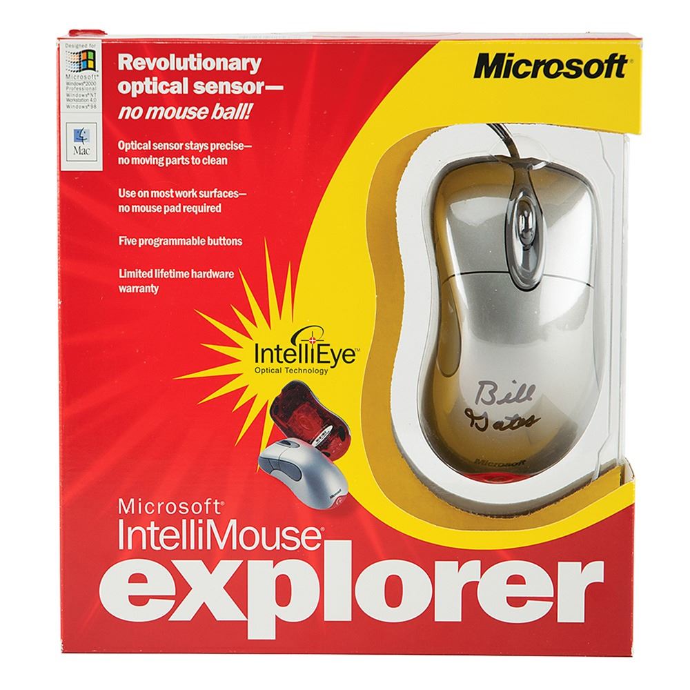Rare original Microsoft IntelliMouse Explorer, signed on the body in black felt tip by Bill Gates. Housed in its original packaging. The revolutionary IntelliMouse Explorer was one of the first to offer an optical sensor, scroll wheel, and dedicated auxiliary buttons on the sides. In very fine condition. The mouse was signed by Gates for a Macy's Passport charity auction in 2003, and is accompanied by the original shipping box and associated paperwork. An unusual and highly desirable format signed by the software pioneer.