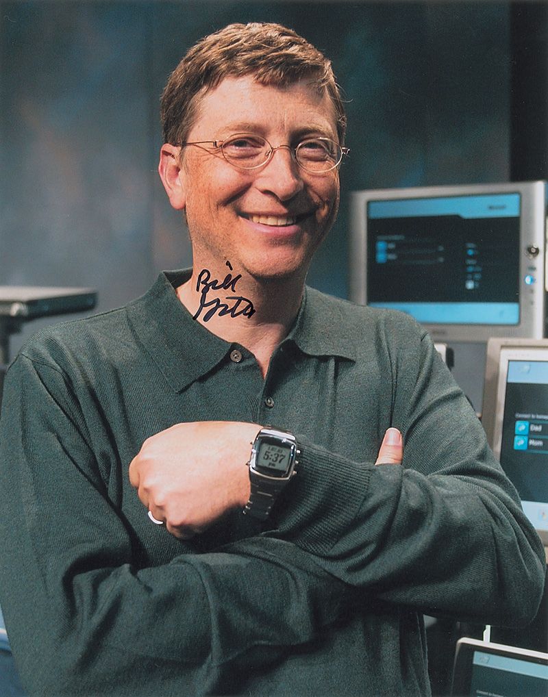 Color satin-finish 11 x 14 photo of Gates posing in front of a bank of monitors, signed in black felt tip. In very fine condition.