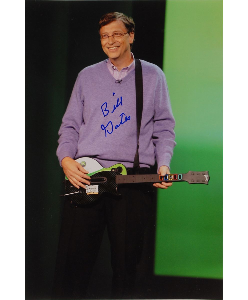 Humorous color satin-finish 12 x 18 photo of Gates playing Guitar Hero, signed in blue felt tip. In fine condition.