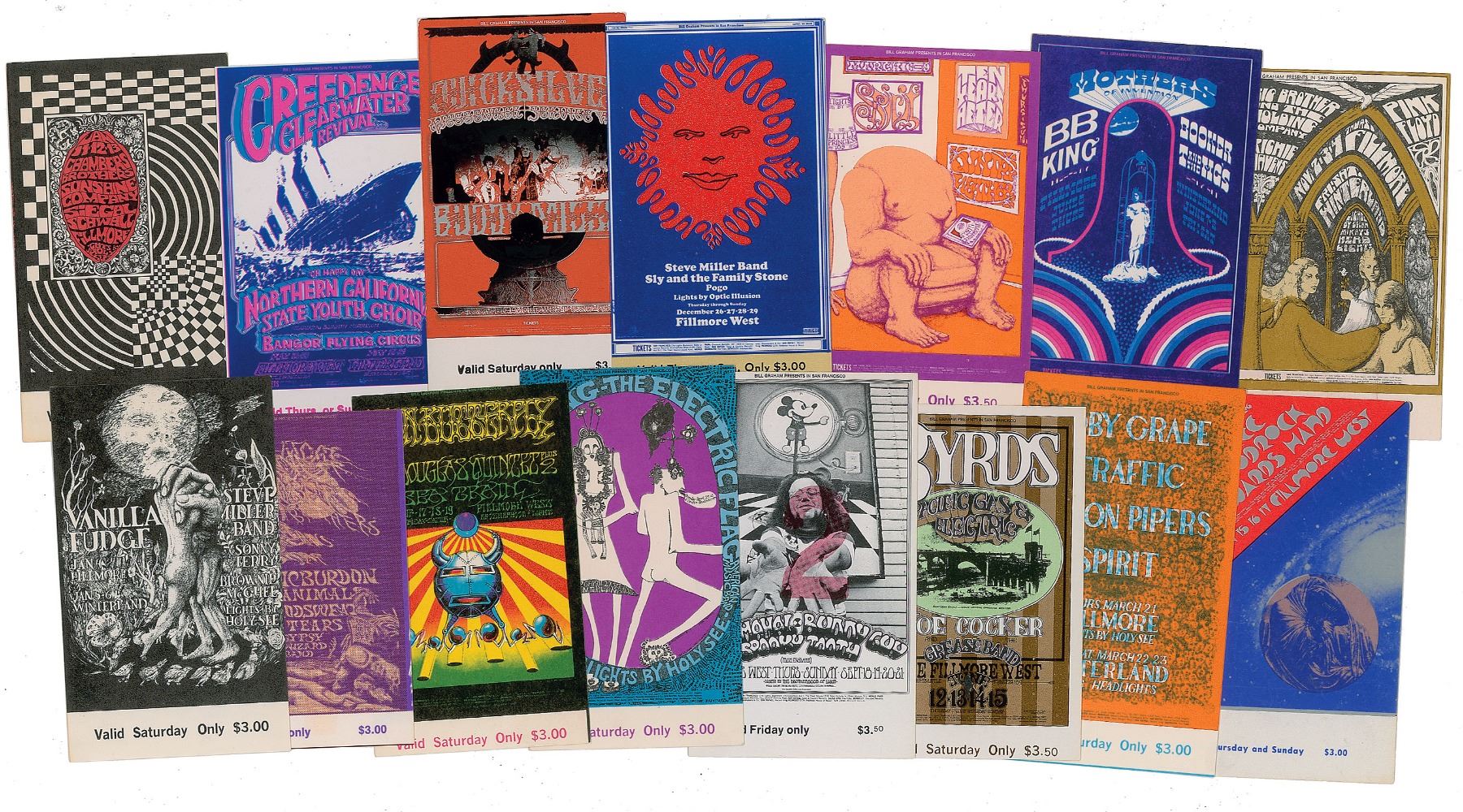 Collection of 15 tickets for Bill Graham-promoted shows from the late 1960s and early 1970s, at the Fillmore West and Winterland, all featuring the classic psychedelic poster artwork used to advertise the concerts. Shows include: Pink Floyd, Big Brother and the Holding Company, and Richie Havens; Chambers Brothers and Sunshine Company; B. B. King and Booker T. and the M. G.'s; Spirit and Ten Years After; Creedence Clearwater Revival; Quicksilver Messenger Service and Buddy Miles; Steve Miller Band and Sly and the Family Stone; Free, Bloodrock, and Edwards Hand; Moby Grape, Traffic, Lemon Pipers, and Spirit; The Byrds and Joe Cocker; Taj Mahal, Buddy Guy, and Spooky Tooth; Albert King and The Electric Flag; Iron Butterfly; Eric Burdon and The Animals, and Blood, Sweat & Tears; and Vanilla Fudge and Steve Miller Band. In overall fine condition.
