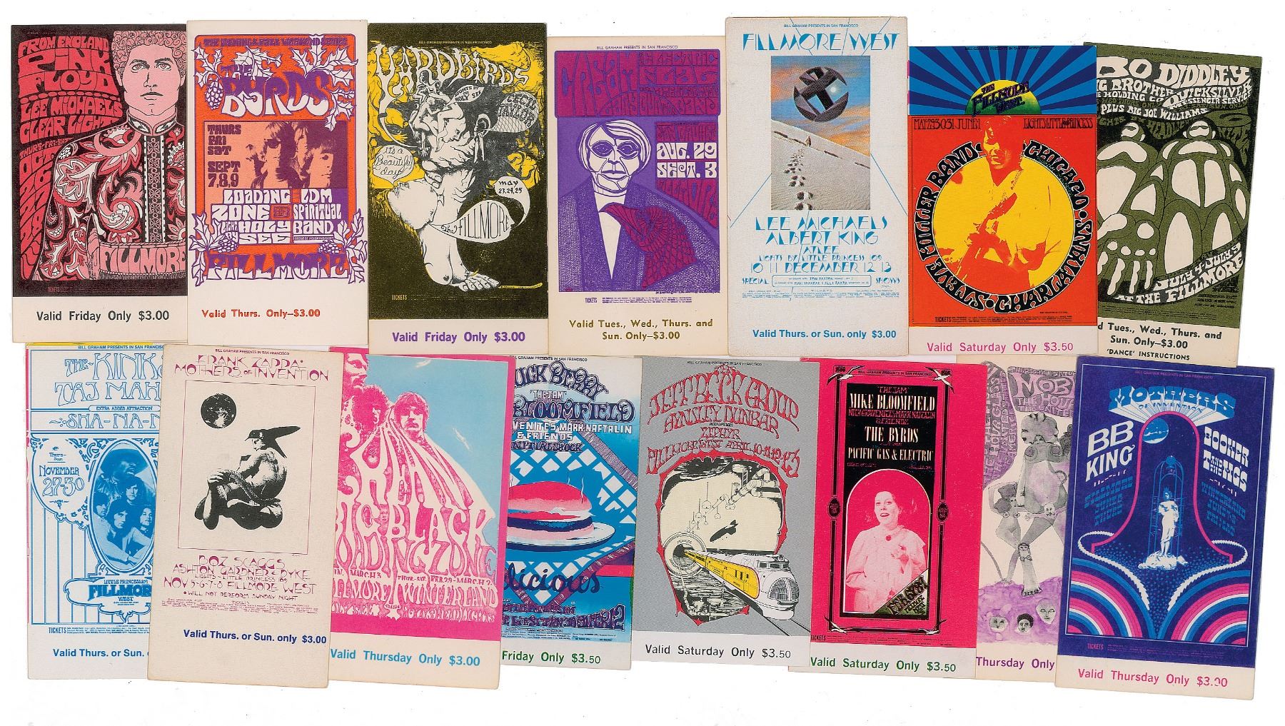 Collection of 15 tickets for Bill Graham-promoted shows from the late 1960s and early 1970s, at the Fillmore West and Winterland, all featuring the classic psychedelic poster artwork used to advertise the concerts. Shows include: Yardbirds; Cream and The Electric Flag; Pink Floyd, Lee Michaels, and Clear Light; Bo Diddley, Big Brother and the Holding Company, and Quicksilver Messenger Service; Lee Michaels and Albert King; The Byrds and Loading Zone; Steve Miller Band, Chicago, and Charlatans; The Kinks, Taj Mahal, and Sha Na Na; Frank Zappa and the Mothers of Invention; Cream, Big Black, and Loading Zone; Chuck Berry and Mike Bloomfield; Jeff Beck and Aynsley Dunbar; Mike Bloomfield and The Byrds; Moby Grape and Country Joe and the Fish; and B. B. King and Booker T. and the M.G.'s. In overall fine condition.