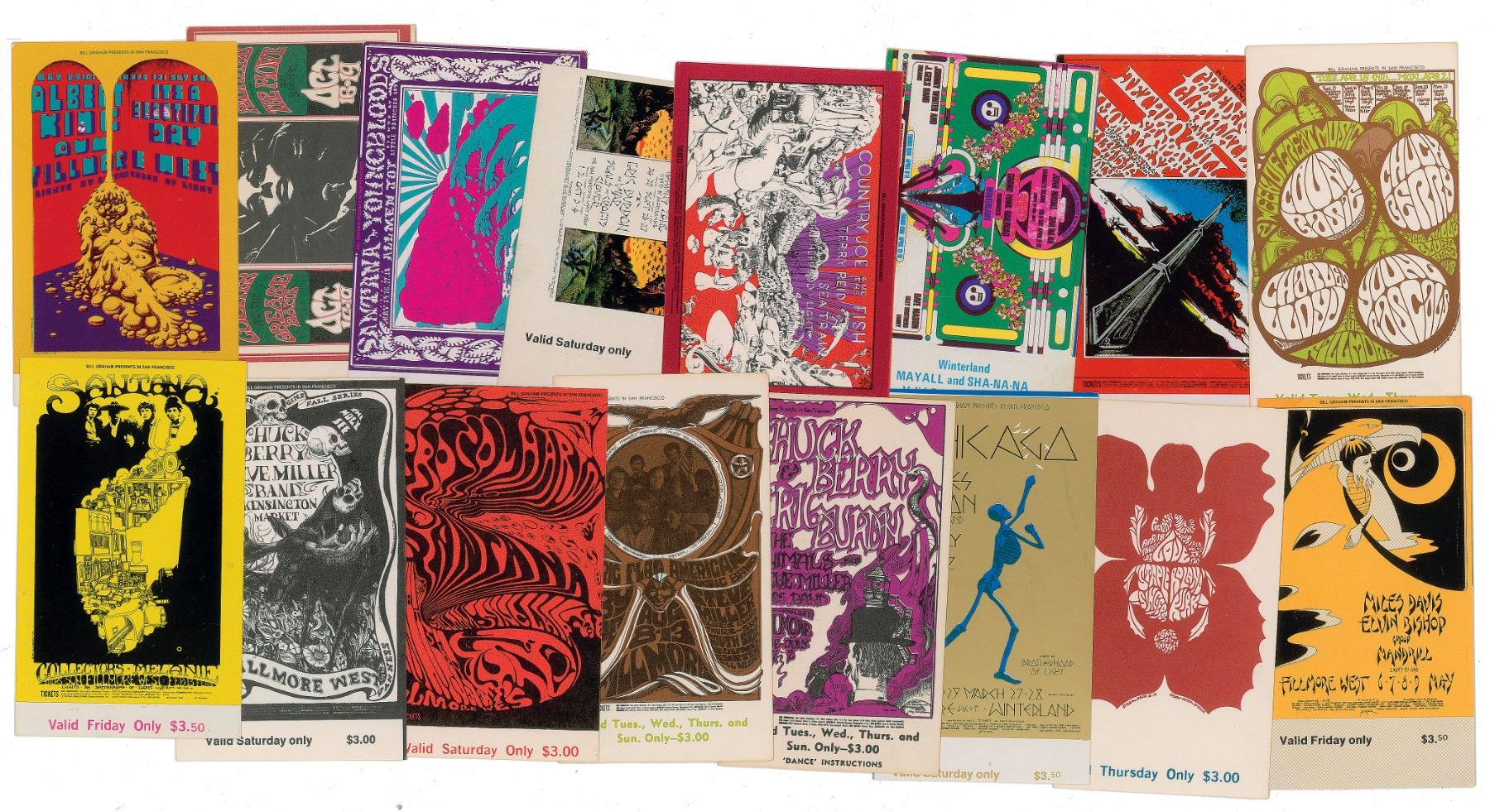 Collection of 16 tickets for Bill Graham-promoted shows from the late 1960s and early 1970s, mostly at the Fillmore West, all featuring the classic psychedelic poster artwork used to advertise the concerts. Shows include: Santana; Chuck Berry and Steve Miller Band; Procol Harum and Santana; Electric Flag, Moby Grape, and Steve Miller; Chuck Berry and Eric Burdon; Chicago and James Cotton; Love, Staple Singers, and Roland Kirk; Miles Davis and Elvin Bishop; Albert King and It's A Beautiful Day; Chuck Berry, Young Rascals, and Steve Miller; Country Joe and the Fish; Chuck Berry, Loading Zone, and War; John Mayall, Sha Na Na, and Grand Funk Railroad; Santana and Youngbloods; Creedence Clearwater Revival and Jethro Tull; and Joe Cocker, Little Richard, and The Move. In overall fine condition.