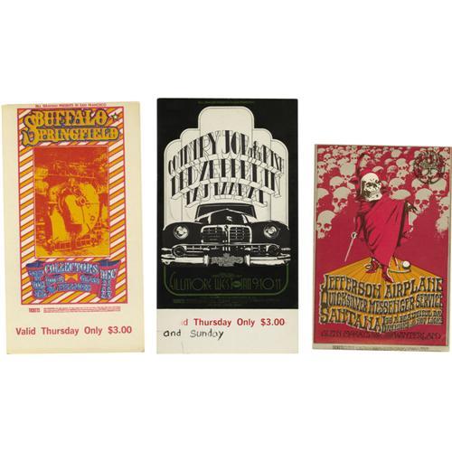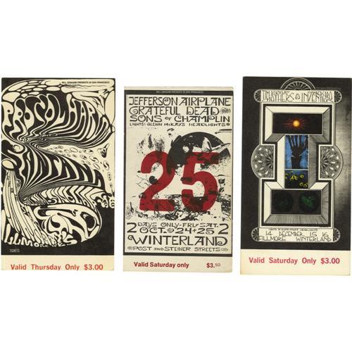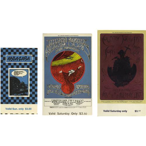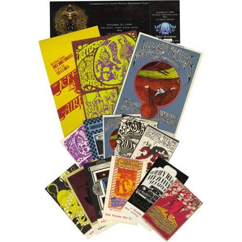 <B>Bill Graham Presents Ticket and Postcard Group (Bill Graham, 1966-99)</B></I> This grouping of unused tickets and postcards is heavy on Jefferson Airplane items. Included: BG tickets 88, 97, 98, 120, 143, 147, 155, 171, 197, 217, and 222. The postcards include BG-1 (printed the same time as the reprint of the poster), BG-88, and BG-171. Other artists include Grateful Dead, Country Joe and the Fish, Quicksilver Messenger Service, Led Zeppelin, Procol Harum, Buffalo Springfield, the Mothers of Invention, and more. As a bonus, this lot includes a 1999 Santana ticket for a New Years Eve performance at the Joint, Hard Rock Cafe, in Las Vegas. Condition ranges from VG+ to Excellent.<BR><BR><b>Shipping:</b> Flat Material, Small (<a target="_blank" href="http://www.heritageauctions.com/common/shipping.php">view shipping information</a>)