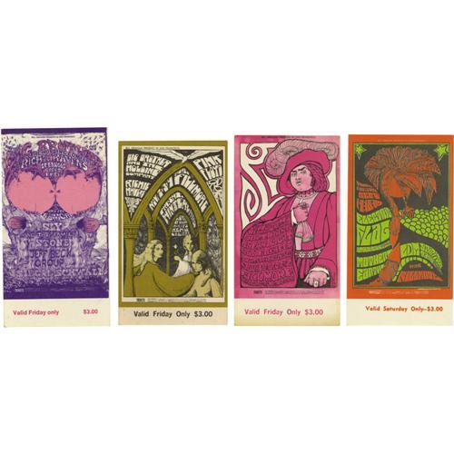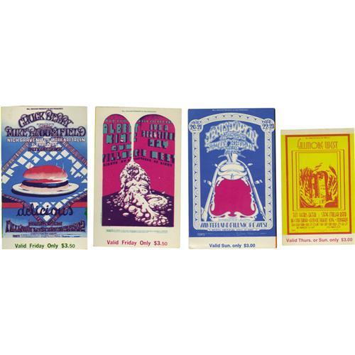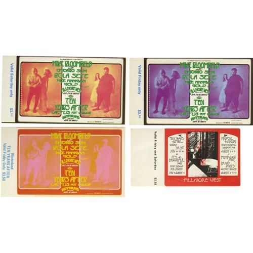 <B>Bill Graham Presents Unused Concert Ticket Group (Bill Graham, 1967-71)</B></I> We've got your ticket -- and more -- with this great grouping of Fillmore, Fillmore West, and Winterland concert tickets! Included: BG-83, BG-91, BG-95, BG-129, BG-158, BG-165, BG-172, BG-183, BG-245, and 3 versions of BG-278. Artists include Ten Years After, Fleetwood Mac, Steve Miller Band, Albert King, Janis Joplin, Chuck Berry, Pink Floyd, Big Brother and the Holding Company, and more. Condition averages VG+ to Excellent.<BR><BR><b>Shipping:</b> Flat Material, Small (<a target="_blank" href="http://www.heritageauctions.com/common/shipping.php">view shipping information</a>)