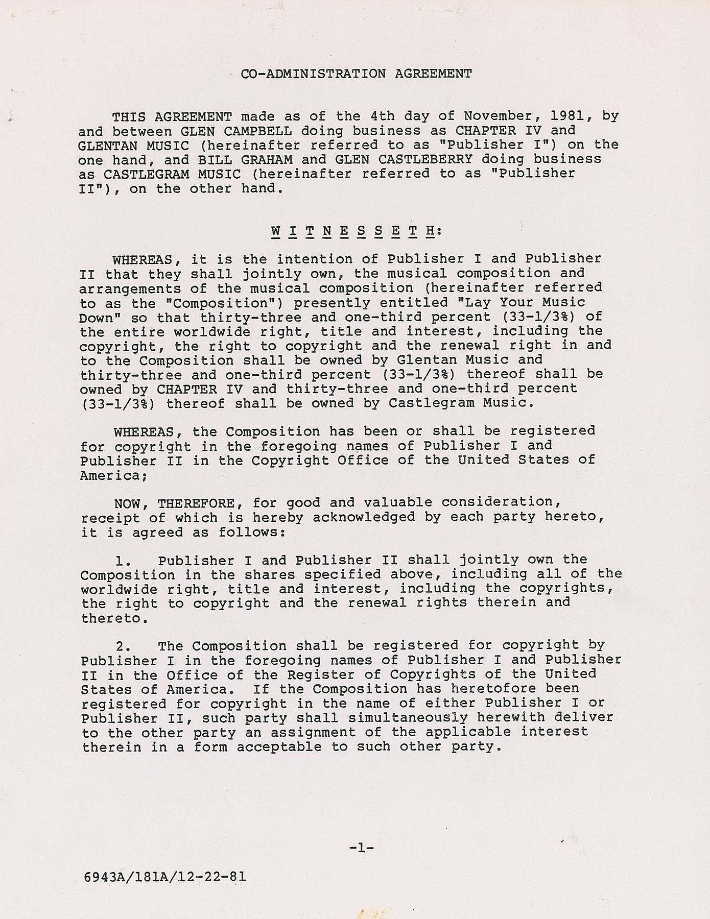DS, seven pages, 8.5 x 11, November 4, 1981. Co-administration agreement made between Glen Campbell, Bill Graham, and Glen Castleberry, regarding the publishing rights to the "musical composition and arrangements…presently entitled 'Lay Your Music Down.'" Signed at the conclusion by Bill Graham and Glen Castleberry, and countersigned twice by a publisher. In fine condition, with staple holes to the top edge.