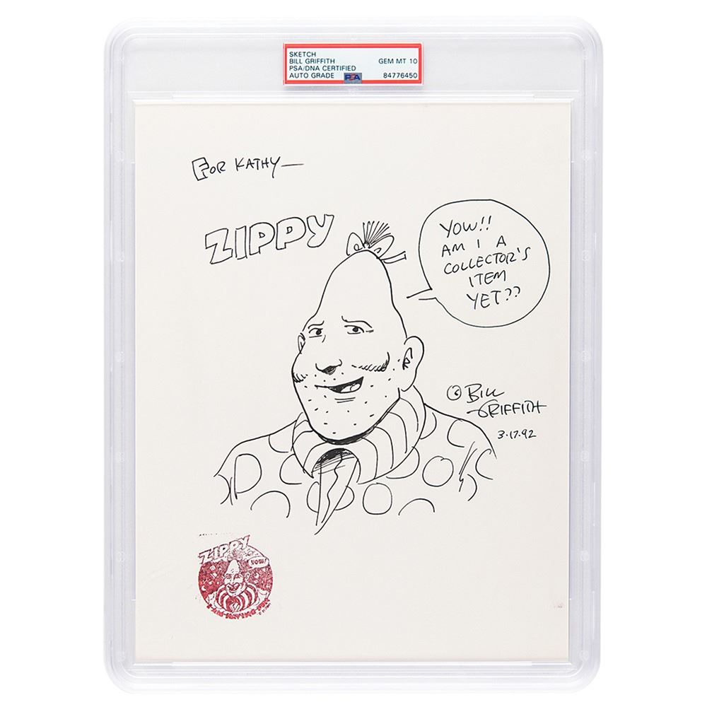 Original sketch by Bill Griffith of Zippy the Pinhead from his Zippy comic strip, accomplished in ink on an off-white 8.5 x 11 sheet, which is signed and inscribed, "For Kathy& mdash;Bill Griffith, 3-17-92," who adds "Zippy" in bubble letters and a speech bubble remark from Zippy: "Yow!! Am I a collector& #39;s item yet??" The lower left bears a Zippy stamp. In very fine condition. Encapsulated and graded by PSA/DNA as "GEM MT 10."