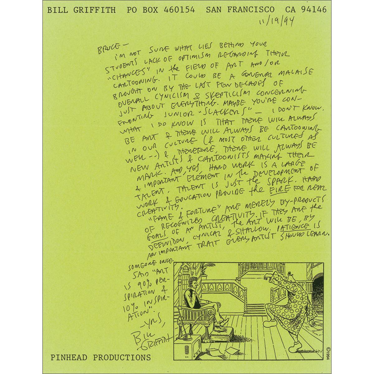 ALS, one bright green page, 8.5 x 11, November 19, 1994. Griffith addresses the next generation of cartoonists. In full: “I’m not sure what lies behind your students lack of optimism regarding their ‘chances’ in the field of art and/or cartooning. It could be a general malaise brought on by the last few decades of overall cynicism & skepticism concerning just about everything. Maybe you’re confronting junior ‘slackers’—I don’t know. What I do know is that there will always be art & there will always be cartooning in our culture (& most other cultures as well) & therefore, there will always be new artists & cartoonists making their mark. And, yes, hard work is a larger & important element in the development of talent. Talent is just the spark. Hard work & education provide the fire for real creativity. ‘Fame & Fortune’ are merely by-products of recognized creativity. If they are the goals an artist, the art will be, by definition, cynical & shallow. Patience is an important trait every artist should learn. Someone once said ‘Art is 90% perspiration & 10% inspiration.’” In fine condition, with scattered light handling wear. Accompanied by the original mailing envelope.