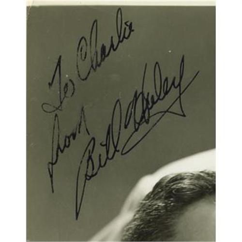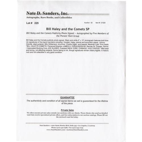 <B>Bill Haley and His Comets Signed Photo.</B></I> A vintage b&w 8" x 10" publicity photo signed by Bill Haley, Johnny Grande, Billy Williamson, Charlie Higler, and Marshall Lytle in black ink. In Very Fine condition with mild tanning and creasing to the corners and edges. <I>Accompanied by a certificate of authenticity.</B></I><BR><BR><b>Shipping:</b> Flat Material, Small (<a target="_blank" href="http://www.heritageauctions.com/common/shipping.php">view shipping information</a>)