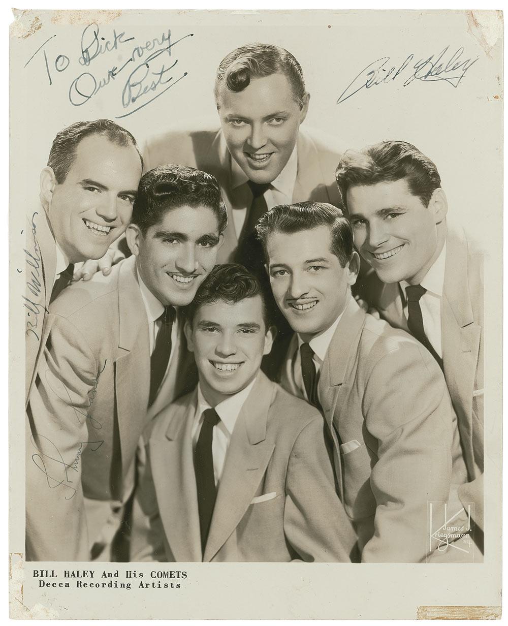 Vintage glossy 8 x 10 promotional photo, signed in fountain pen by Bill Haley, Bill Williamson, and Johnny Grande, with the added inscription “To Dick, Our Very Best.” In very good condition, with irregular ink adhesion to Haley’s first name, tape remnants and surface loss at edges, and scattered light surface marks.