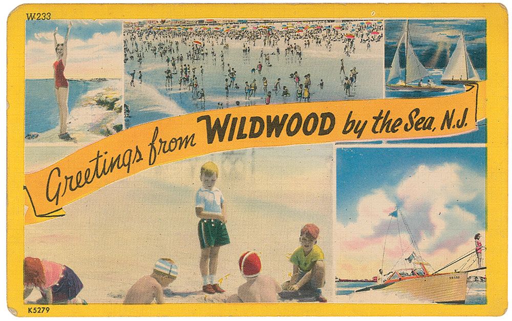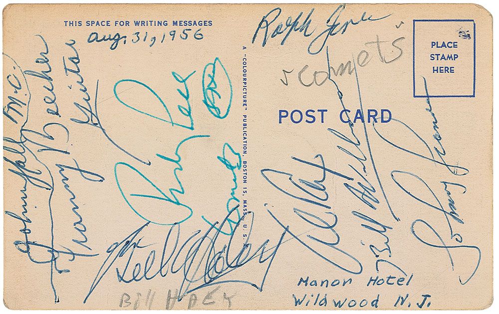 Vintage color 5.5 x 3.5 postcard for Wildwood, New Jersey, signed on the reverse in ballpoint by Bill Haley, Johnny Grande, Bill Williamson, Ralph Jones, Al Rex, Franny Beecher, and Rudy Pompilli. Top of the postcard is dated August 31, 1956, in a collector’s hand. In fine condition, with a couple small pencil notations and a mild shade of overall toning.