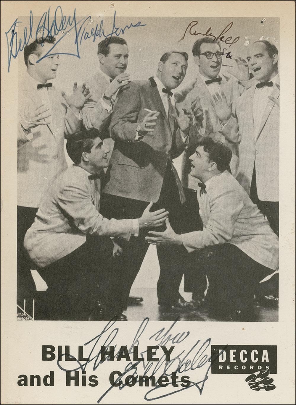 Vintage Decca Records promotional postcard for Bill Haley and His Comets, 4.75 x 6.5, signed in black or blue ballpoint on the front by Bill Haley, Ralph Jones, and Rudy Pompilli and the front, and Al Rex, Billy Williamson, Johnny Grande, and Franny Beecher on the reverse. In very good condition, with light toning (a slightly heavier strip along the top border), ding to the left corner, edge trimming, several small pinholes along the top touching the signatures of Haley and Jones. There is also an unobtrusive stamped signature of Haley in the bottom border. Unique item from the dawn of the Rock and Roll era. Pre-certified Roger Epperson/REAL and RRAuction COA.