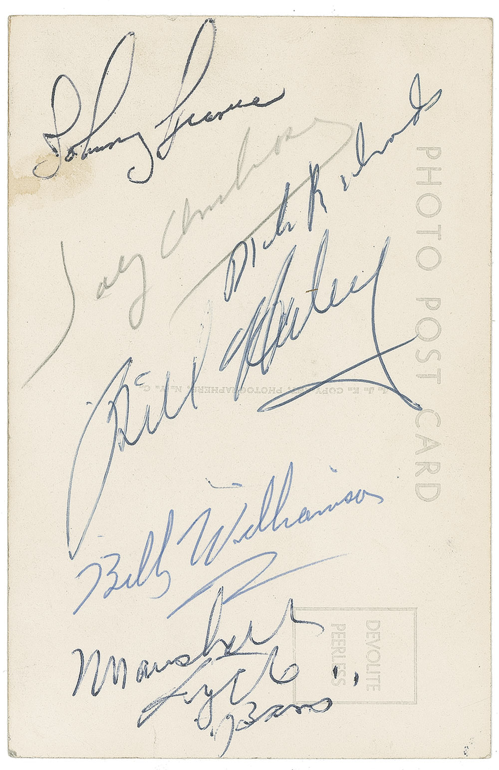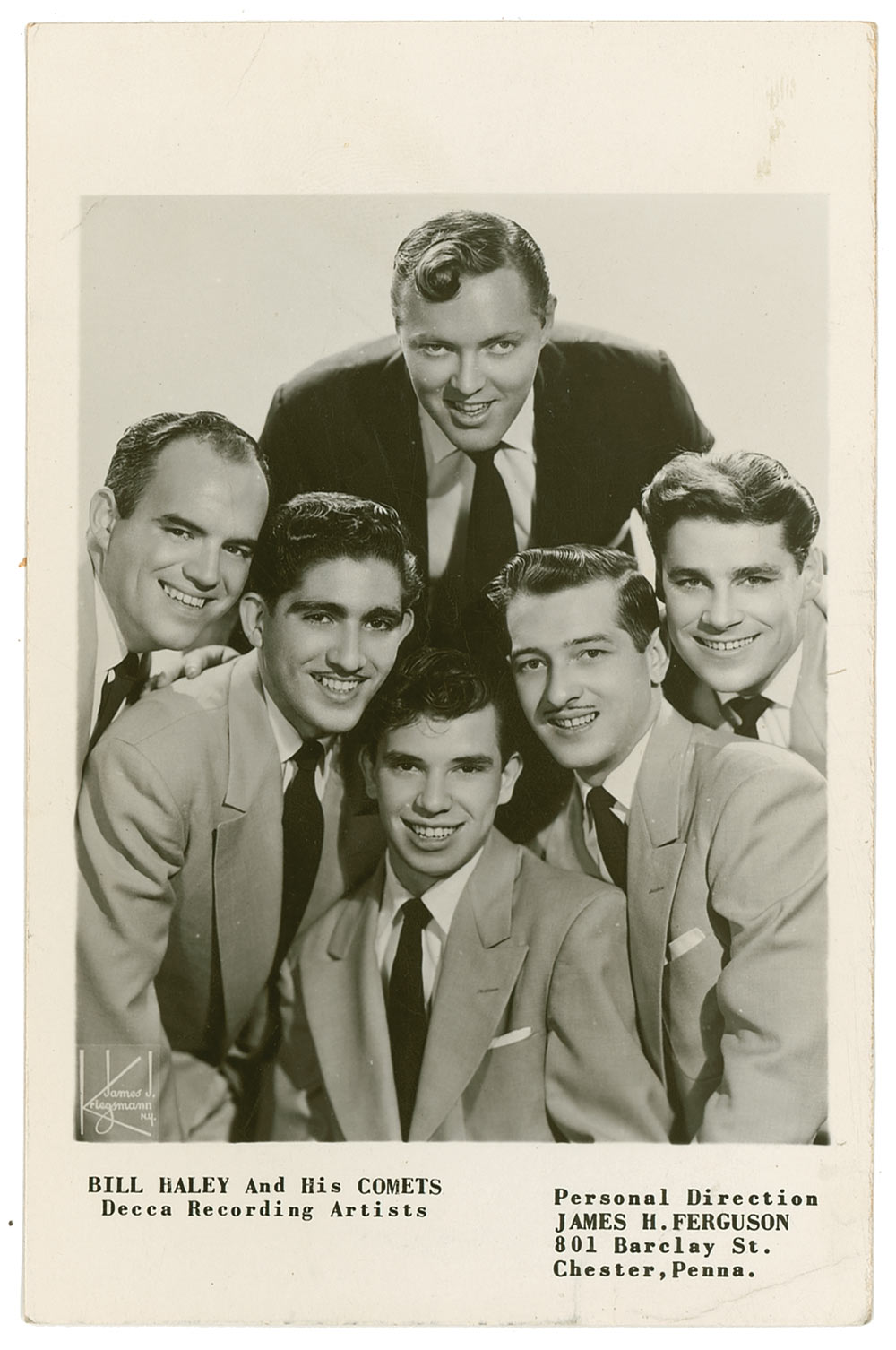 Vintage 3.5 x 5.5 promotional postcard photo of Bill Haley and his Comets, signed on the reverse in ballpoint by Bill Haley, Johnny Grande, Dick Richards, Billy Williamson, and Marshall Lytle, and signed in pencil by one other. A few creases to image, as well as surface impressions from signatures on reverse, and some scattered light soiling to both sides, otherwise fine condition. One of rock and roll’s greatest pioneers.