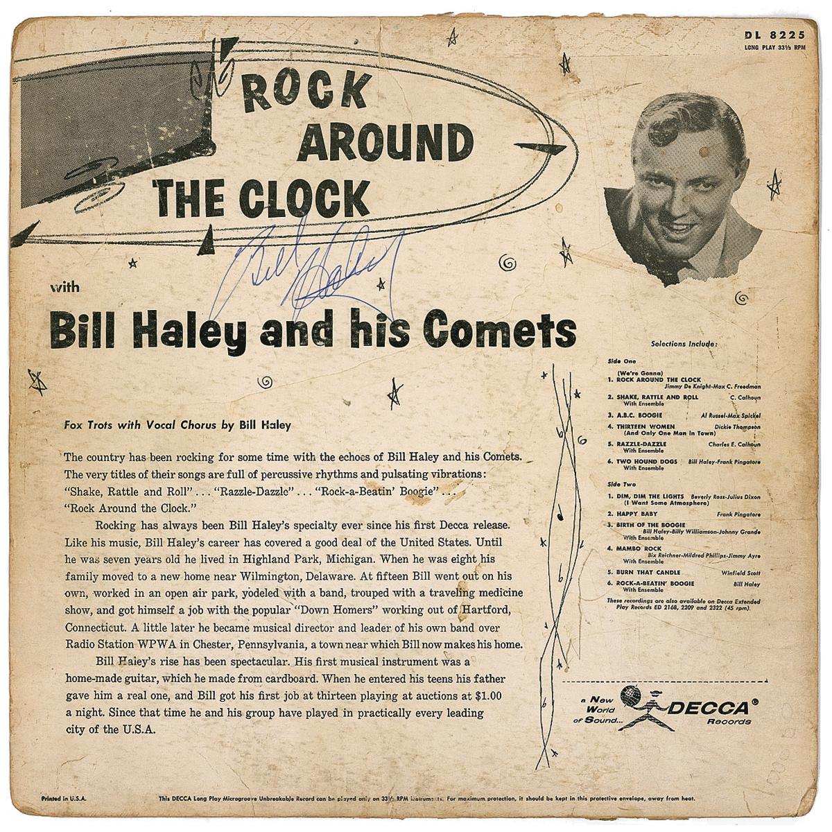 Rock Around the Clock album signed on the back cover in blue ballpoint. In good condition, with front and back covers detached, scattered moderate toning and soiling, some loss to front cover, as well as some scattered light surface loss. Haley’s signature is largely unaffected by the flaws. The record is included. Quite rare in signed albums.