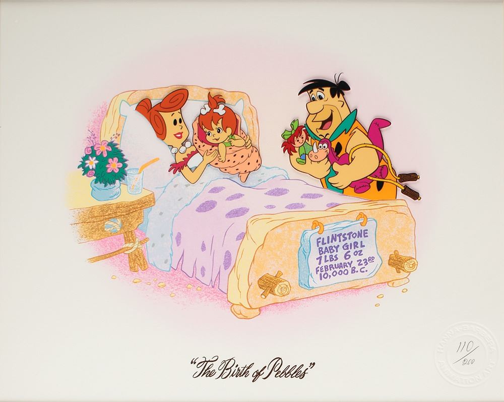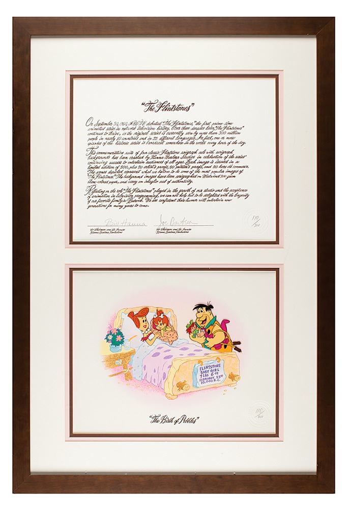 (Hanna-Barbera Studios, 1993) Very desirable original limited edition serigraph cel entitled 'The Birth of Pebbles,' numbered 110/200, depicting Fred Flintsone carrying toys and visiting his wife Wilma and his new baby daughter, Pebbles; a sign on the hospital bed reads: "Flintstone, Baby Girl, 7 lbs 6 oz, February 23rd, 10,000 B.C." Includes its rare original letter of authenticity that is signed in pencil by Bill Hanna and Joe Barbera. The cel, which measures 13.5 x 10.75, is placed on a color serigraph background on Westwind 300-gram blanc-colored paper, and the character images measure 3.75 x 3.25 (Fred) and 3.25 x 2.5 (Wilma and Pebbles). Both the background and the LOA feature a matching intaglio seal of authenticity, and both are attractively triple-matted and framed together to an overall size of 21.75 x 32. In fine condition. This serigraph is one of a suite of four designs that were produced to commemorate the enduring success of the Flinstones franchise.