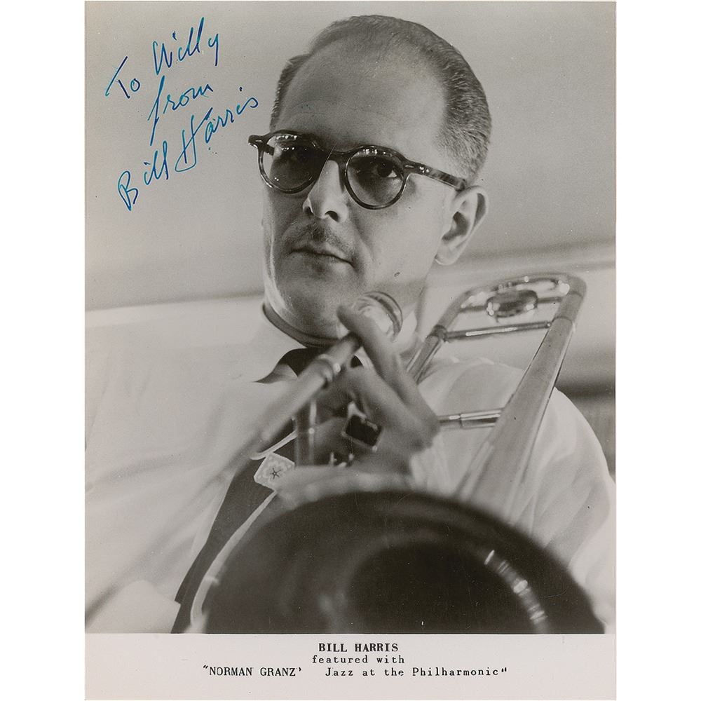 Vintage glossy 7.25 x 9.75 publicity photo of Harris holding his trumpet close to the camera, signed and inscribed in blue fountain pen, "To Willy, from, Bill Harris.†In fine condition, with trimmed edges, two creases on Harris' nose, and irregular emulsion to the top from a small piece of cardboard affixed to the reverse.