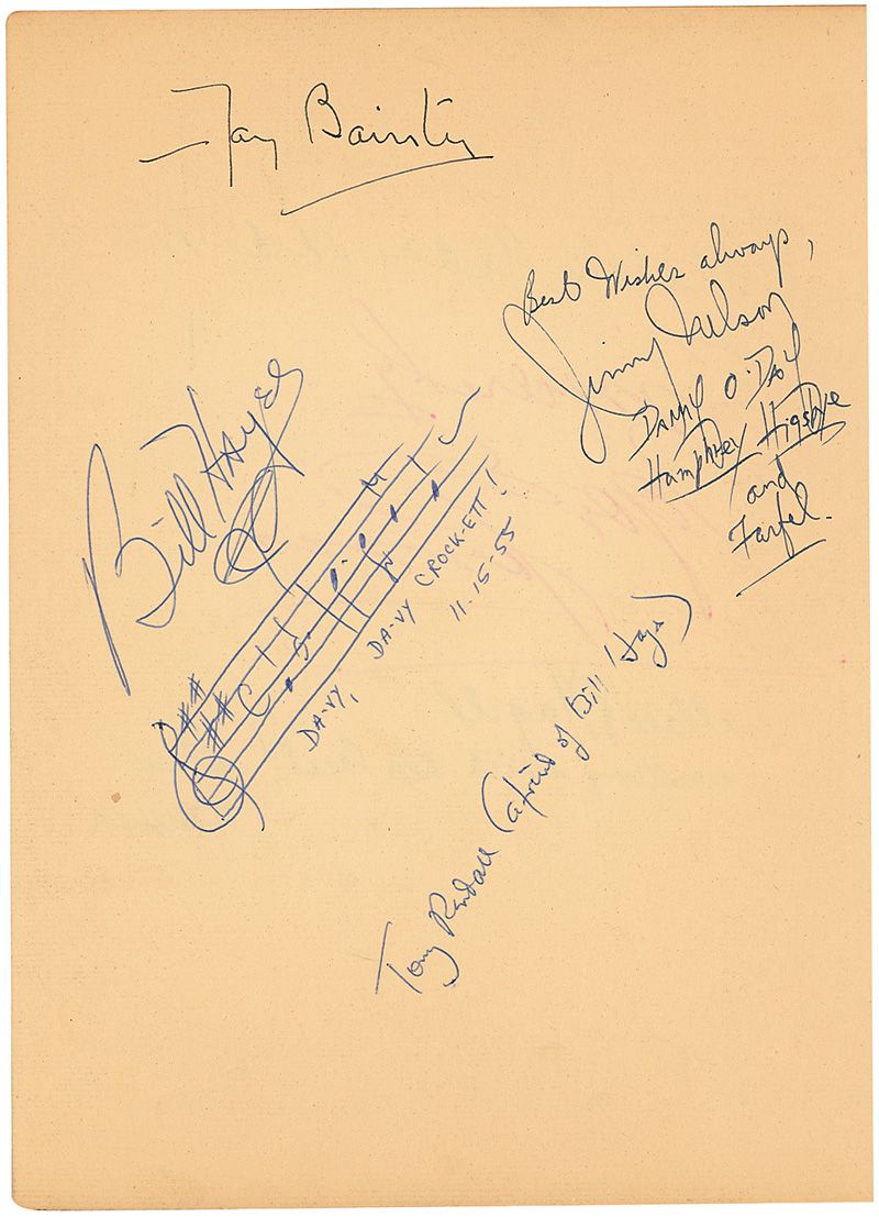 Actor and musician whose version of the ‘Ballad of Davy Crockett’ reached number one on the Billboard chart. AMQS on an off-white 8 x 11 guest book page. Hayes pens two bars of music and lyrics to the ‘Ballad of Davy Crockett,” signed at the top, “Bill Hayes,” and dated underneath November 15, 1955.” page is also signed on both sides by six others including Fay Bainter, Tony Randall, and Jeannette MacDonald. In fine condition, with a bit of scattered mild toning.