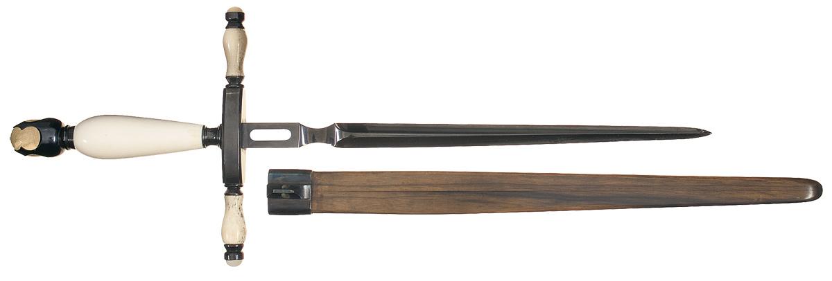 Condition: Excellent, with a couple of barely noticeable chips on the blade and some scattered minor handling marks overall. The handle has a few barely noticeable hairline age cracks, with all of the ivory having a nice grain pattern. The sheath has a hairline crack, otherwise excellent with some scattered mild scratches.